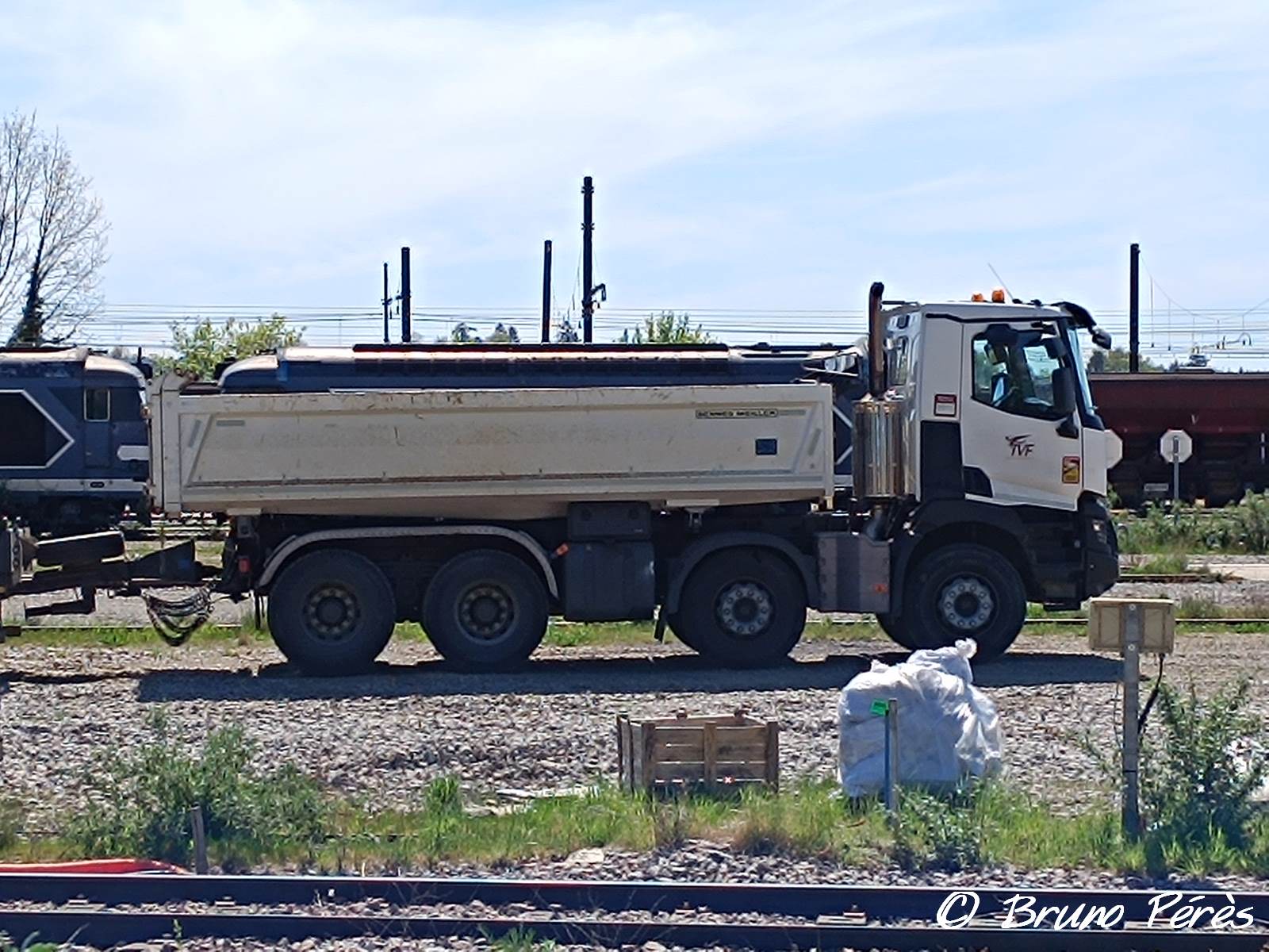 Camion benne Renault non identifié aperçu avec sa remorque le 11/04/2025 sur le triage de Puy-Imbert (87).