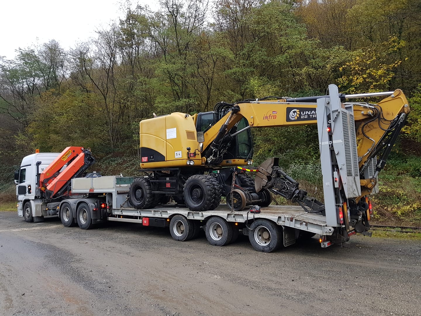 Remorque Kaiser porte engins routiers et ferroviaires CZ 908 FE Ã Mulhouse Wanne le 06/02/2021