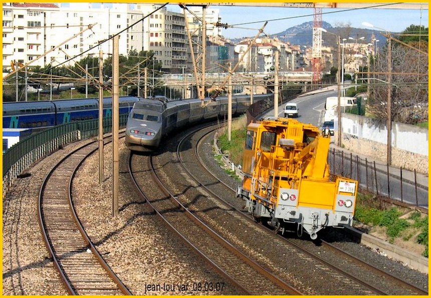 La draisine-grue MR 7.359 vient de dépasser la gare de Toulon côté est et croise un TGV SE s'y arrêtant.