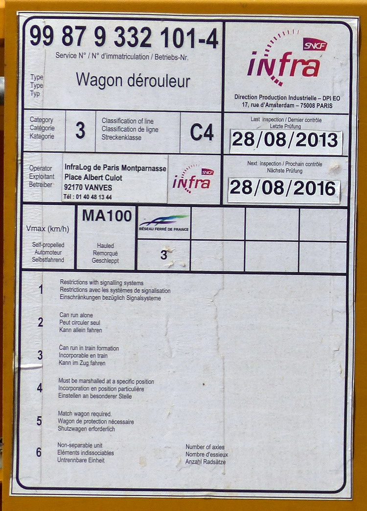 parisienne entre le wagon enrouleur 99 87 332 001-6 INFRA SNCF-PRG (DPI 10095 - 28-08-2013/2016) des photos sur le lien