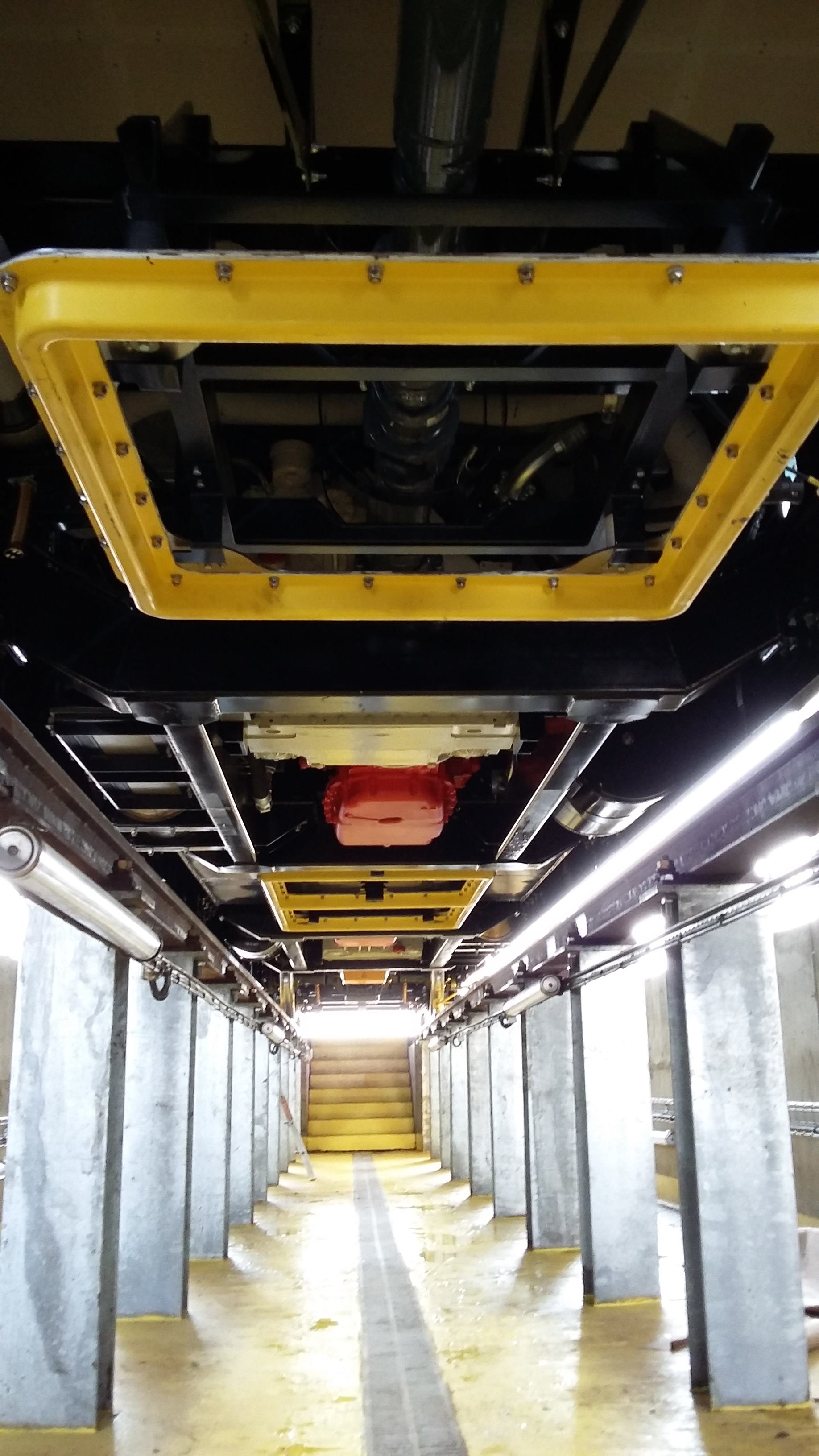 Pour finir voici la draisine BROOM préparée pour les essais: le nez est démonté, des tampons provisoires sont montés et la machine pourra être mise en véhicule avec l'attelage UIC standard lorsque l'attelage "de secours" Scharffenberg installé à demeure sous le carénage sera démonté.
