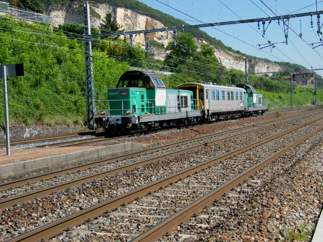 Voiture de contrôle de la géométrie de la voie encadrée par deux BB 66000