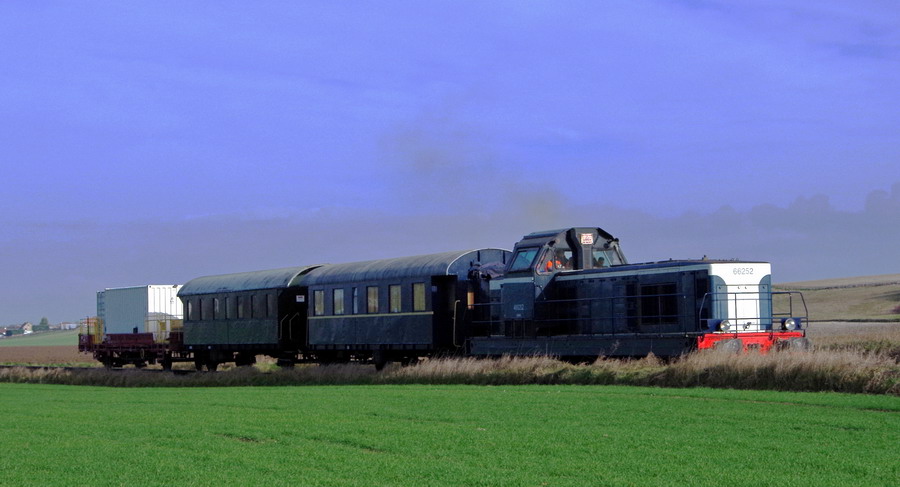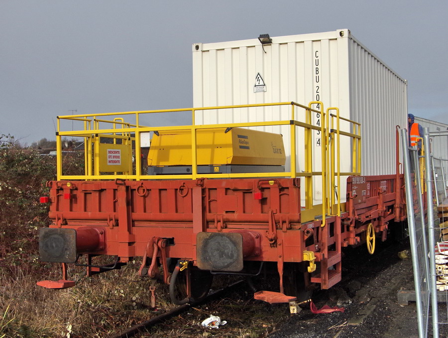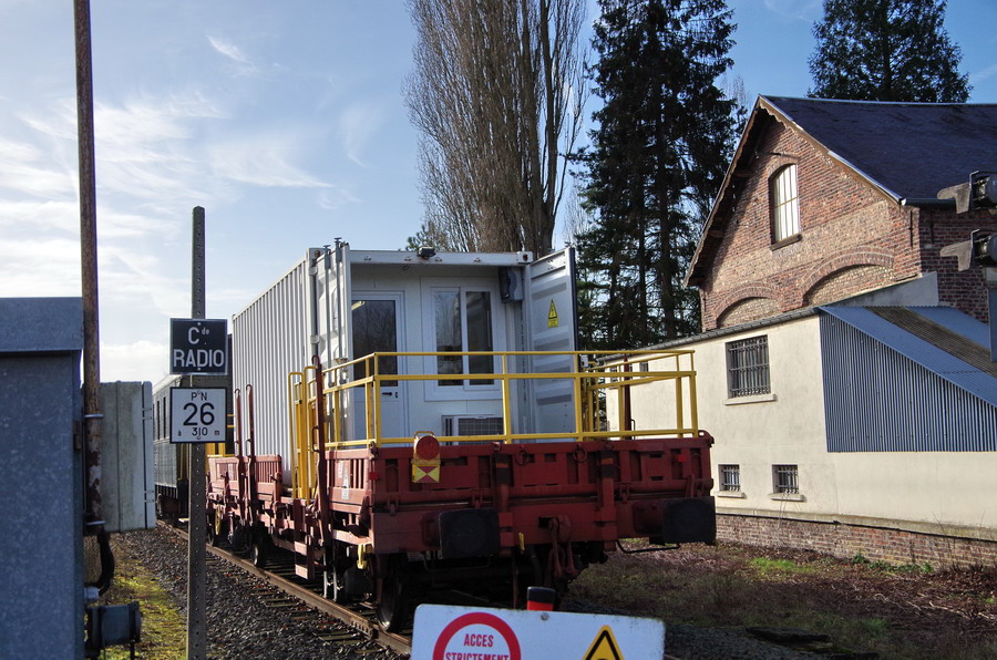 avec un container pour la télémétrie (Dispositif Remorqué d'Inspection de la Géométrie de la voie) et qui appartient maintenant