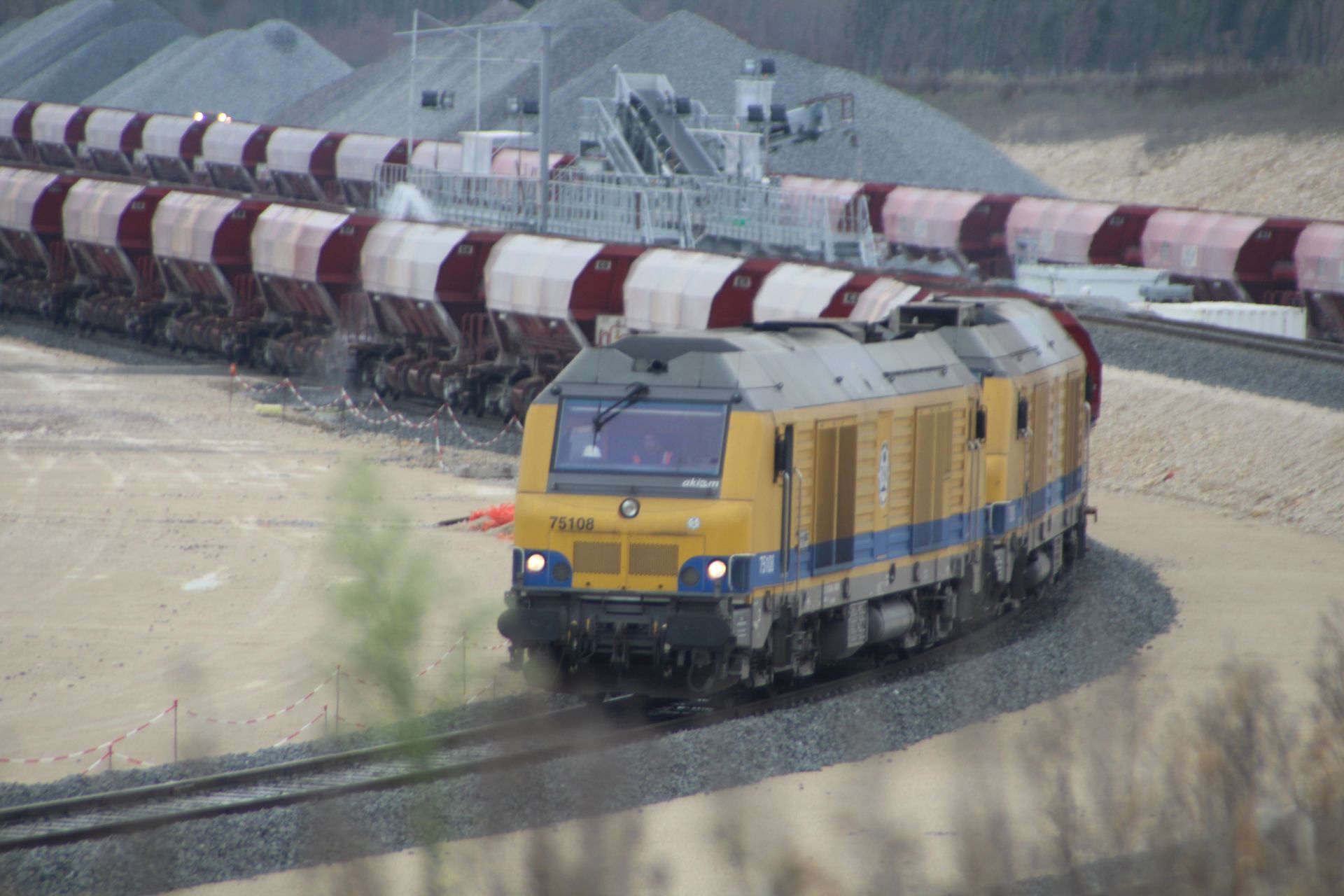 Une UM 75000 manœuvrent une rame de ballaste.
