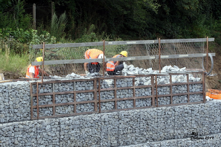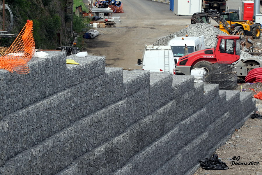 suite des travaux pour le mur de soutènement en pierre empilées dans des cages grillagées le 02-07-2019