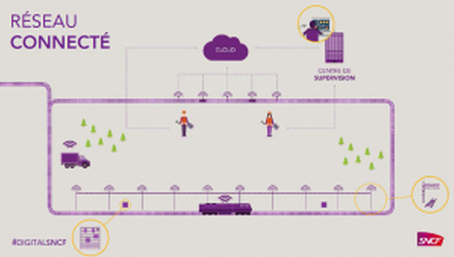 Le réseau connecté de la SNCF comprend les capteurs pour collecter les informations sur le terrain, un réseau bas débit pour transmettre les données, et des centres de supervision où les données sont analysées et structurées. Le réseau connecté se matérialise comme suit :