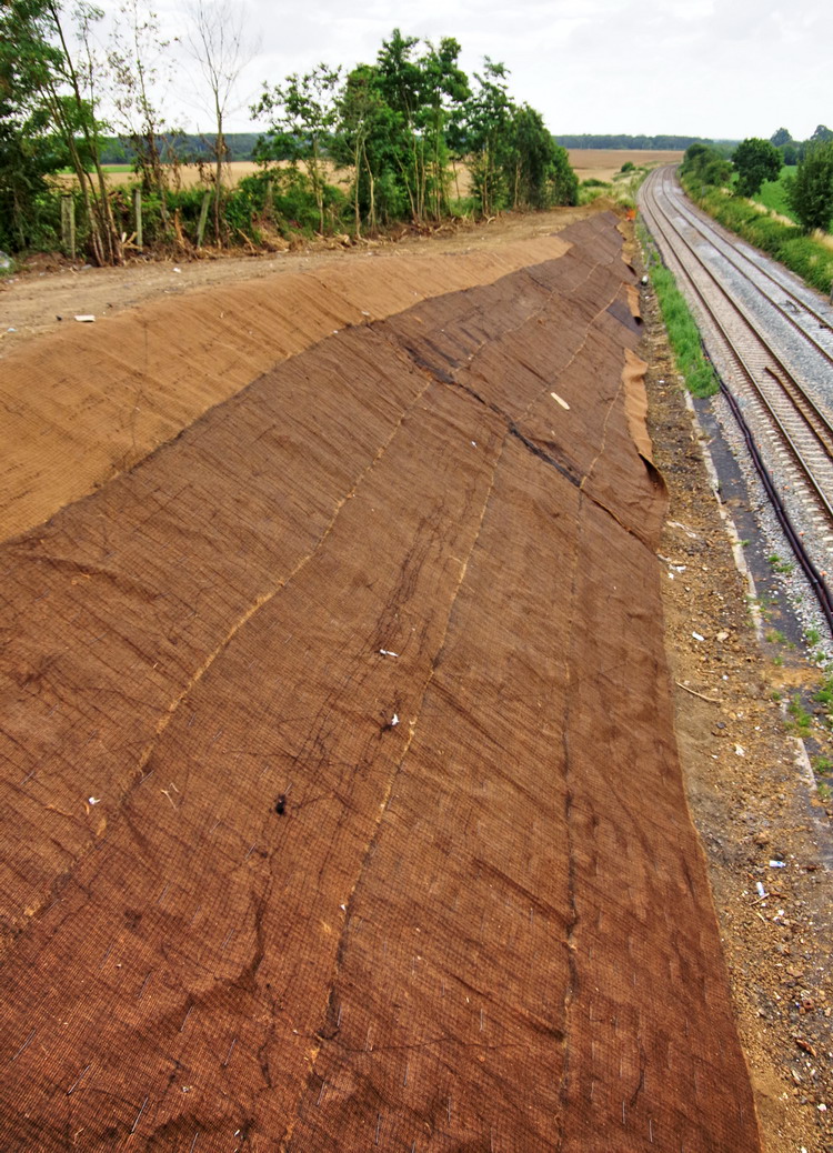 le talus recouvert de géotextiles en fibre de coco naturelle biodégradables et écologiques. de la société Tensar