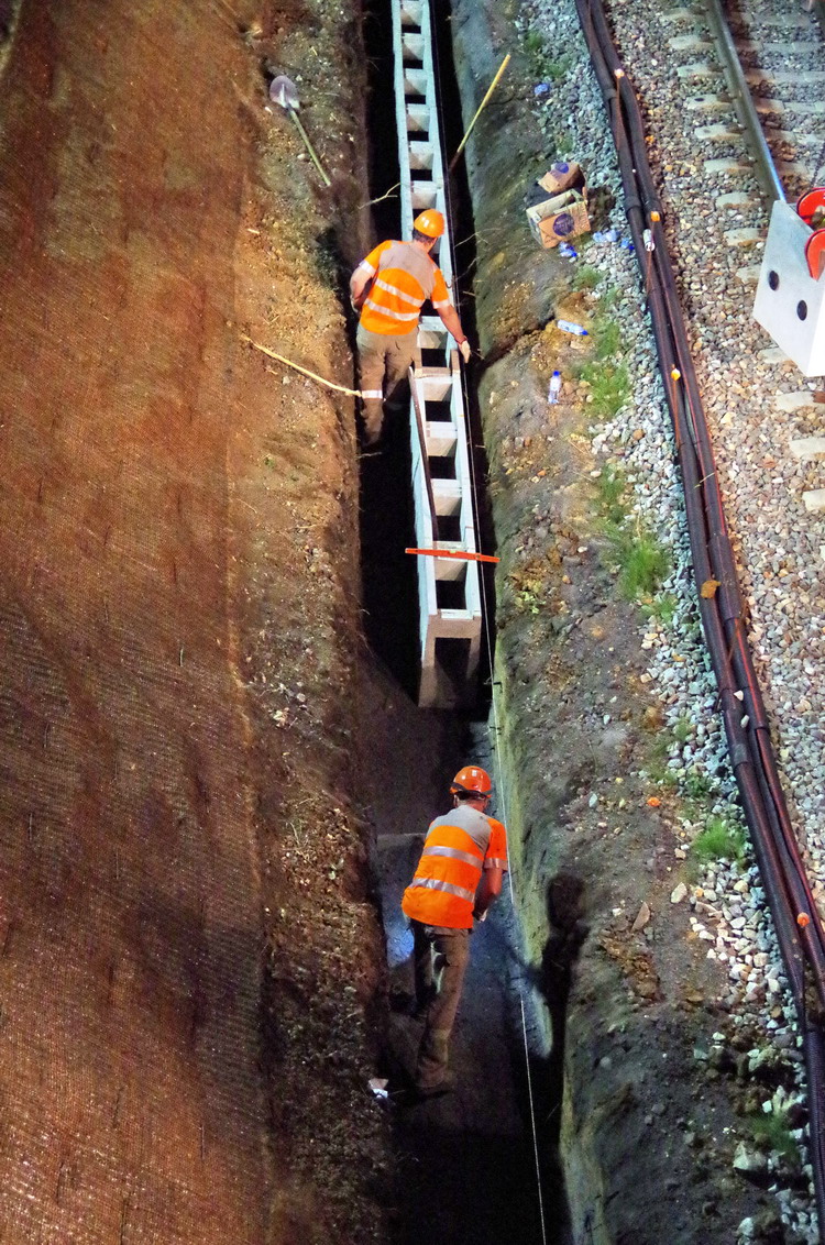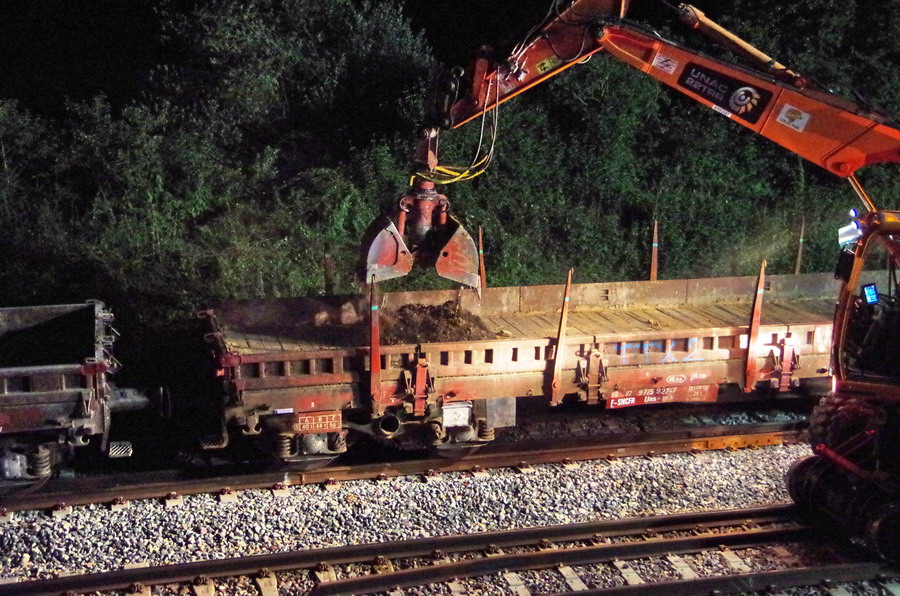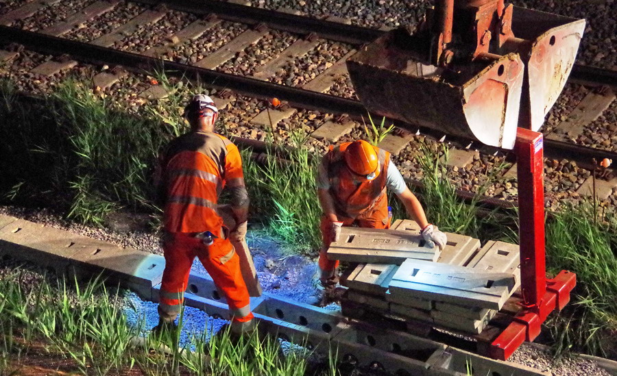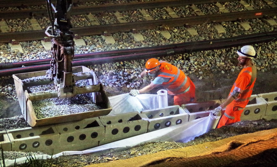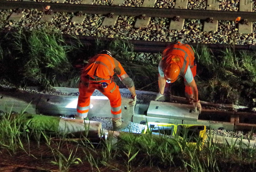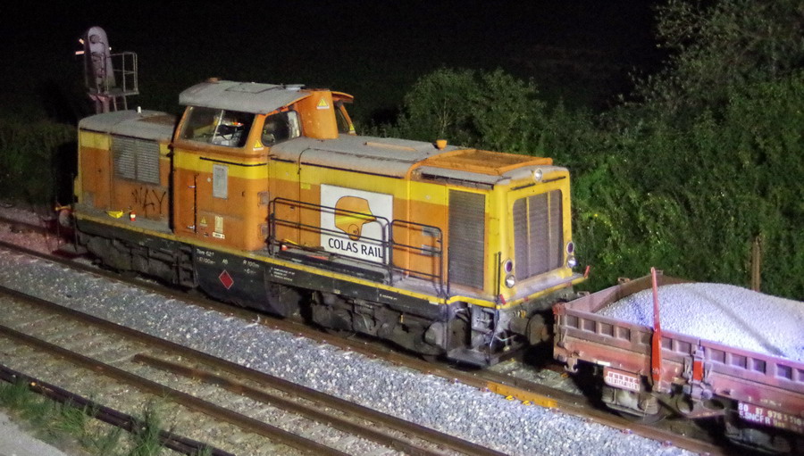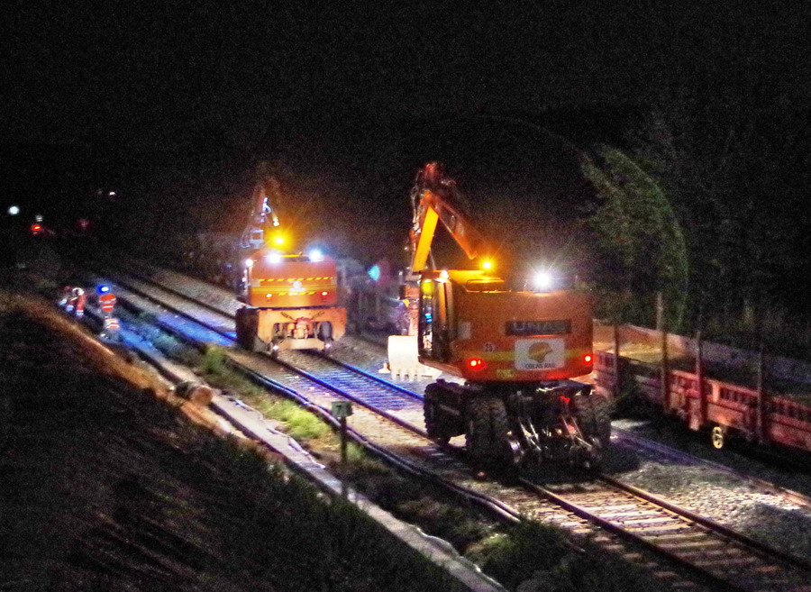 nuit du 26 au 27 juillet 2018 avec le travail pour l'installation des caniveaux par Colas Rail au niveau des ponts de Bray à la bifurcation de Jussy