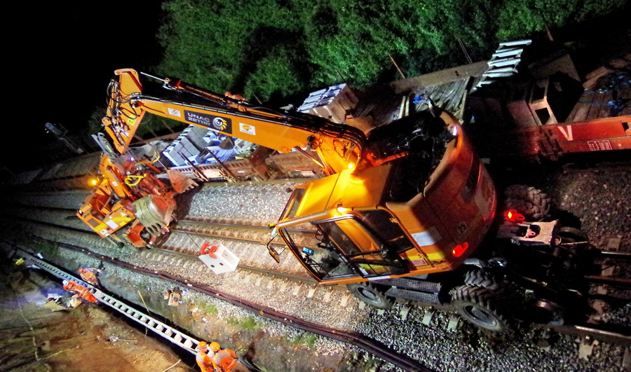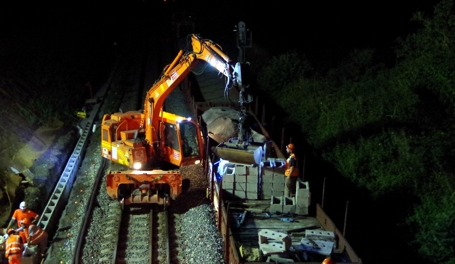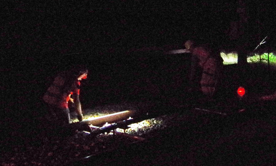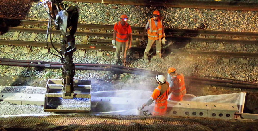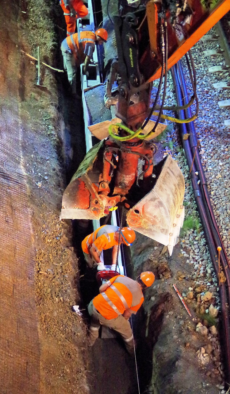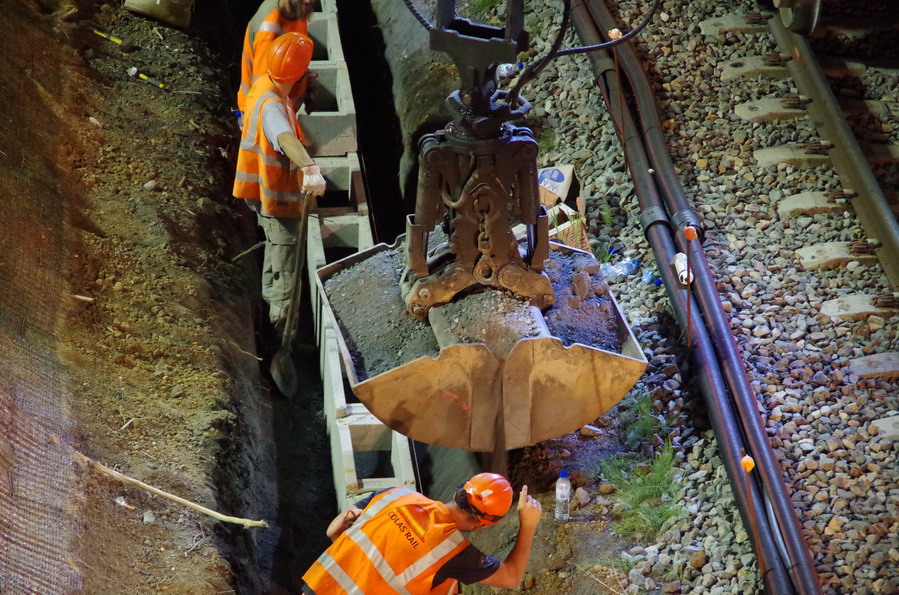 nuit du 26 au 27 juillet 2018 avec le travail pour l'installation des caniveaux par Colas Rail au niveau des ponts de Bray à la bifurcation de Jussy