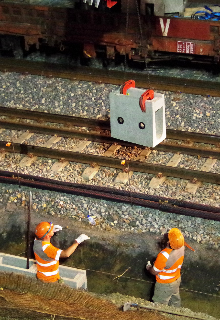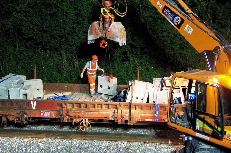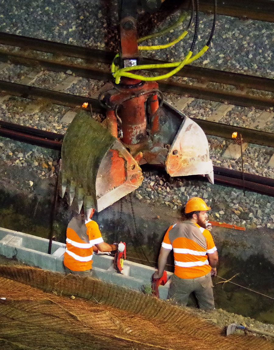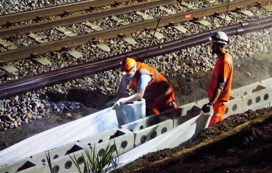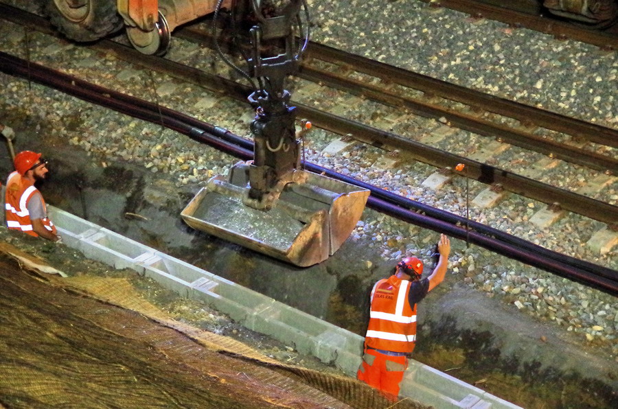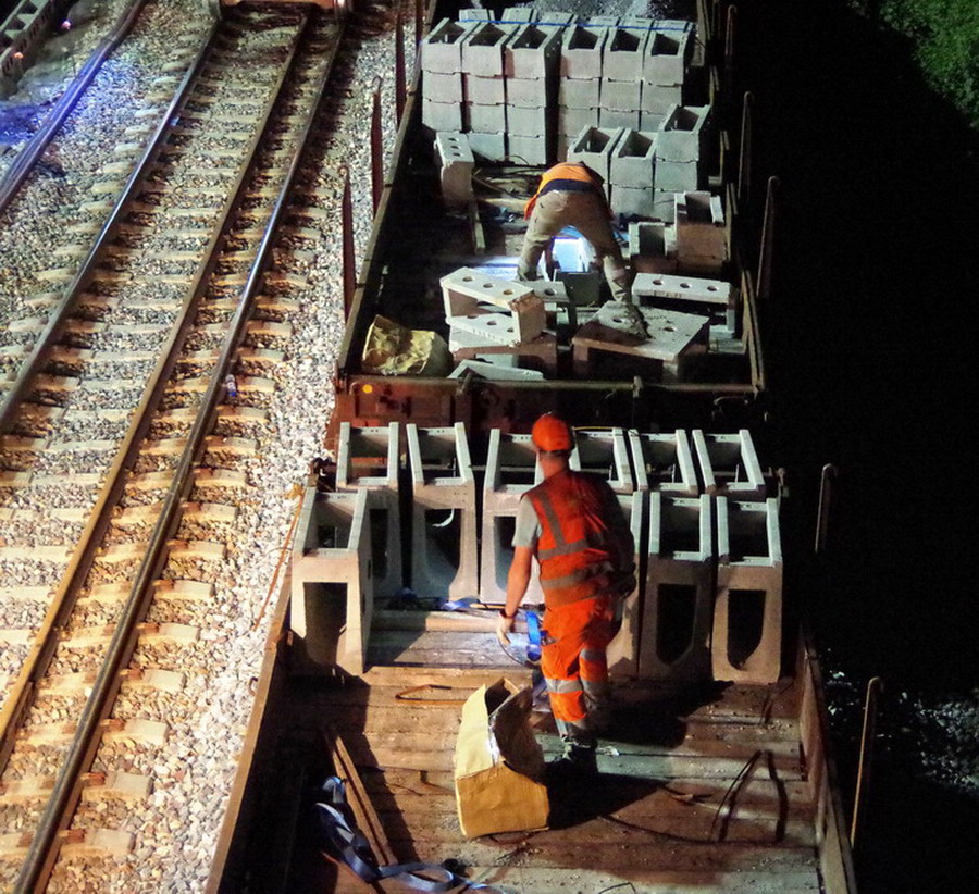 nuit du 26 au 27 juillet 2018 avec le travail pour l'installation des caniveaux par Colas Rail au niveau des ponts de Bray à