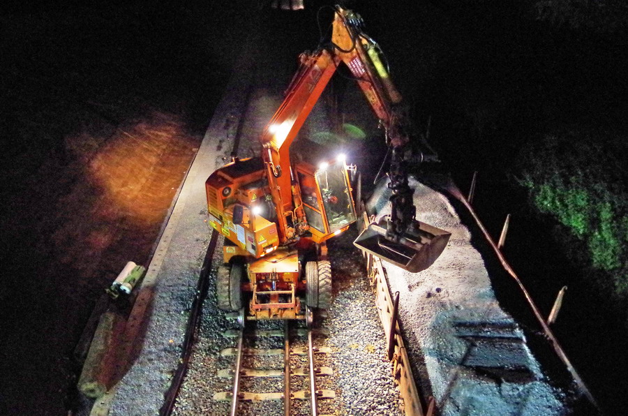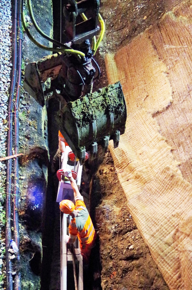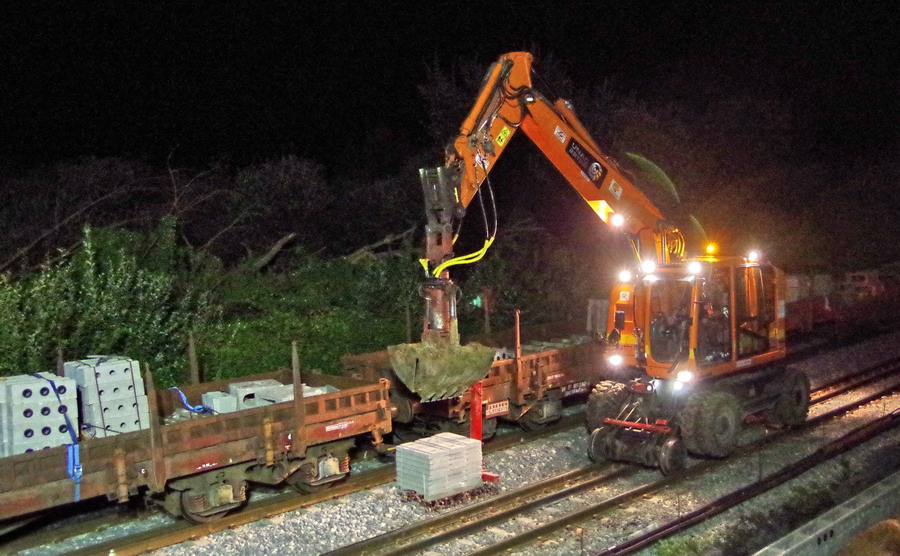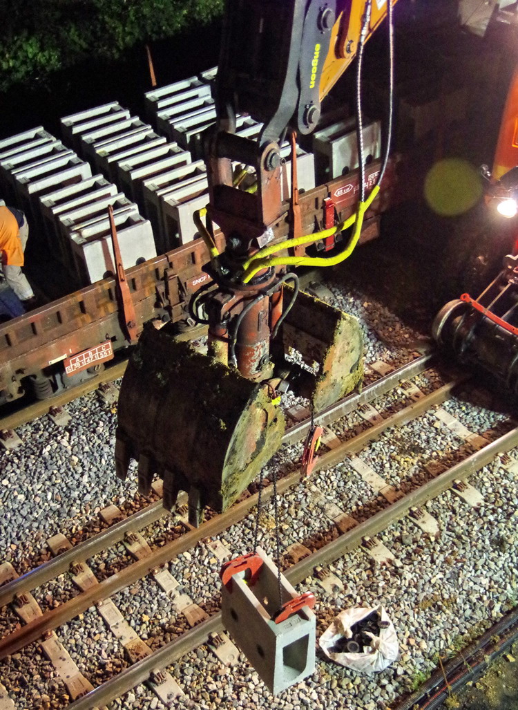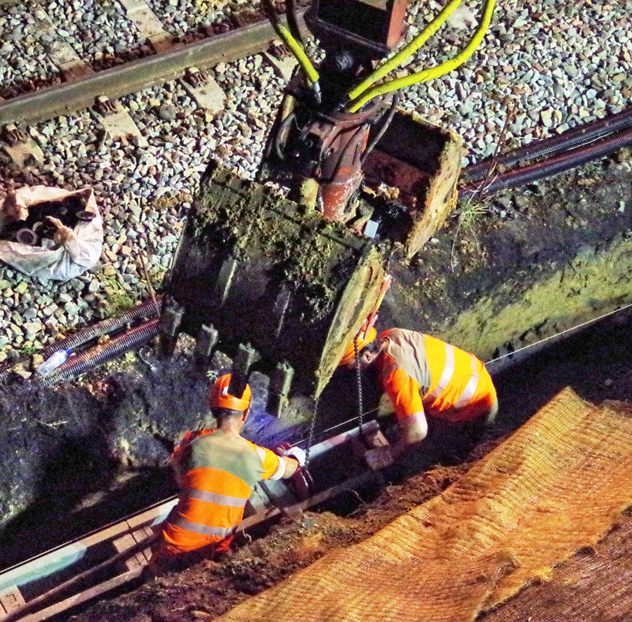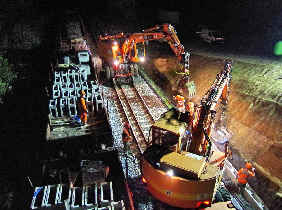 avec la présence des deux Pelles Rail route Colas Rail pour les travaux de caniveau