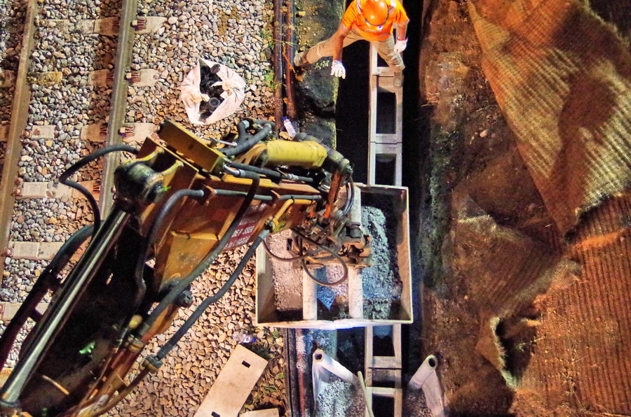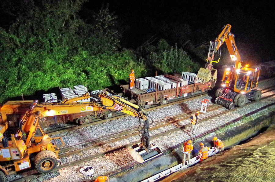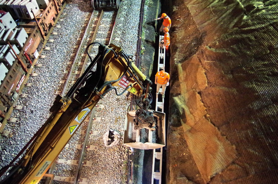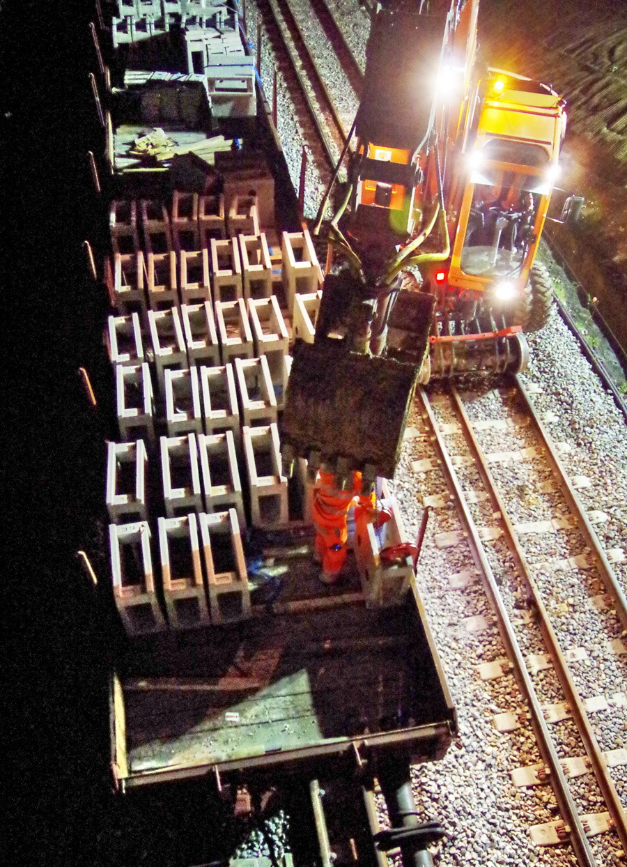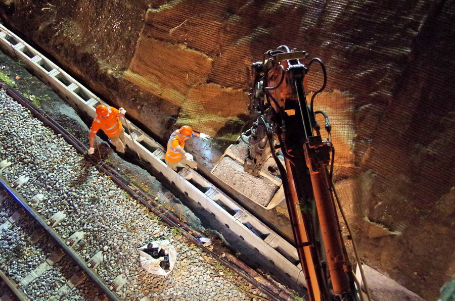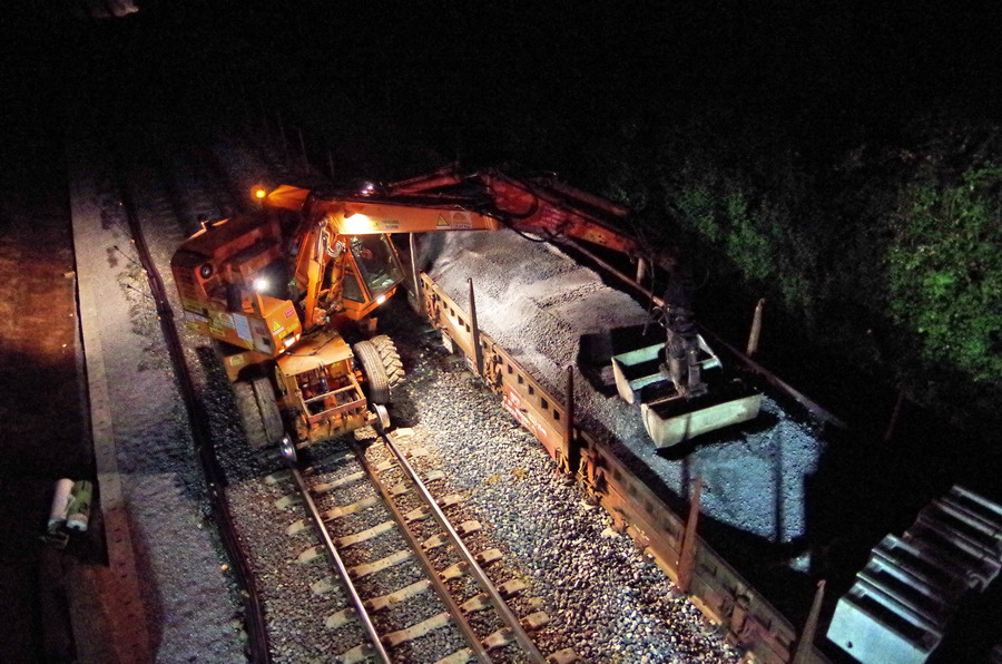 avec la présence des deux Pelles Rail route Colas Rail pour les travaux de caniveau