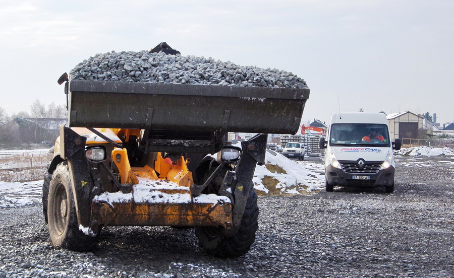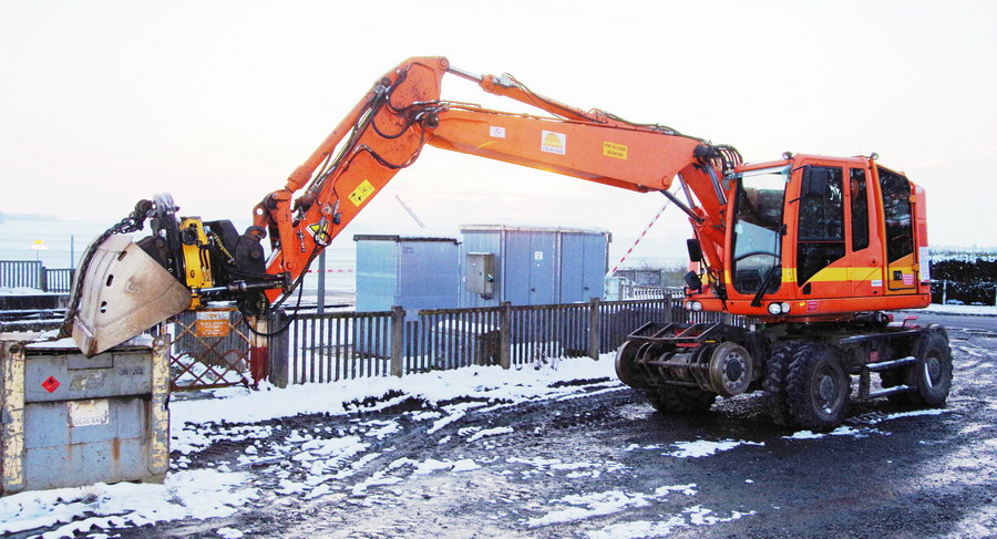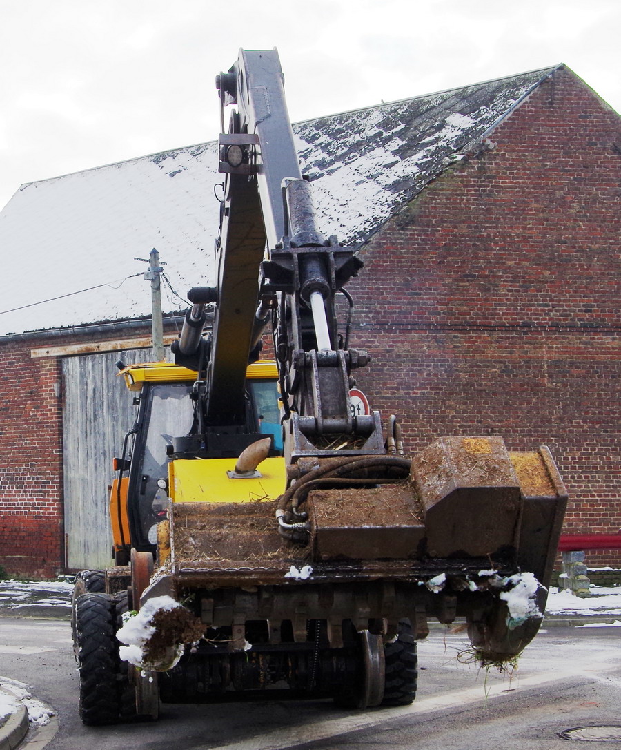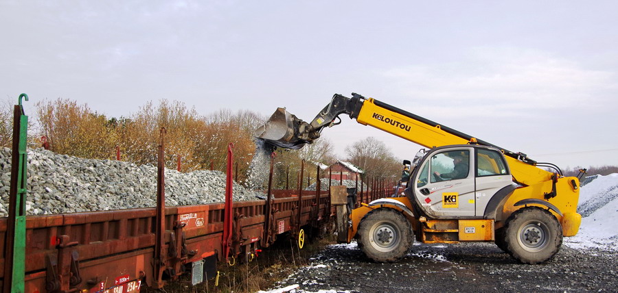 chargement des wagons trémies D12 avec une Pelle route Komat'su de type PW 180 en gare de Ham le 07-02-2018