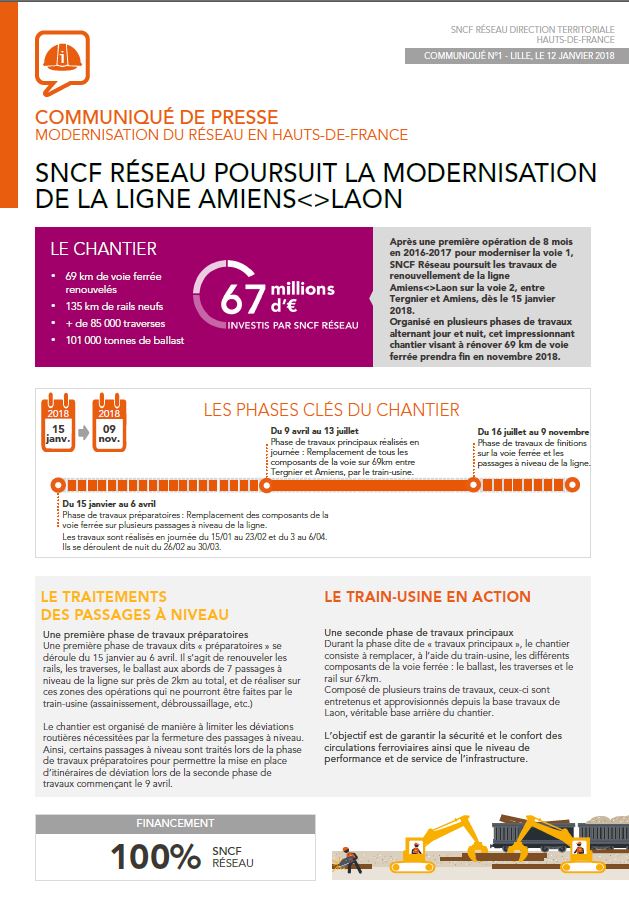 Programmée jusqu’au 13 juillet, cette phase de travaux principaux sera réalisée en journée et se traduira par le remplacement de tous les composants de la voie sur 69 km entre Tergnier et Amiens, par le train-usine. Les trains seront approvisionnés depuis la base travaux de Laon, véritable base arrière du chantier. La phase de travaux de finition aura lieu du 16 juillet au 9 novembre.