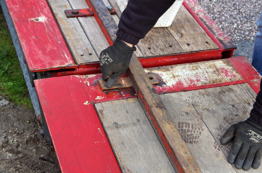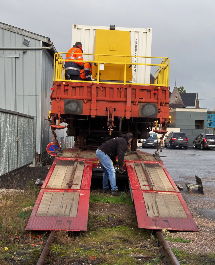 déchargement du wagon par le treuil du camion en gare d'Origny-Sainte-Benoîte le 09 janvier 2019