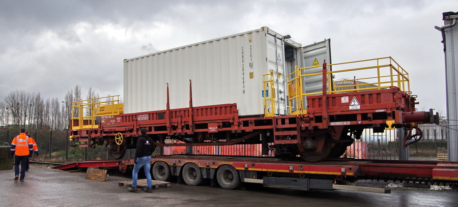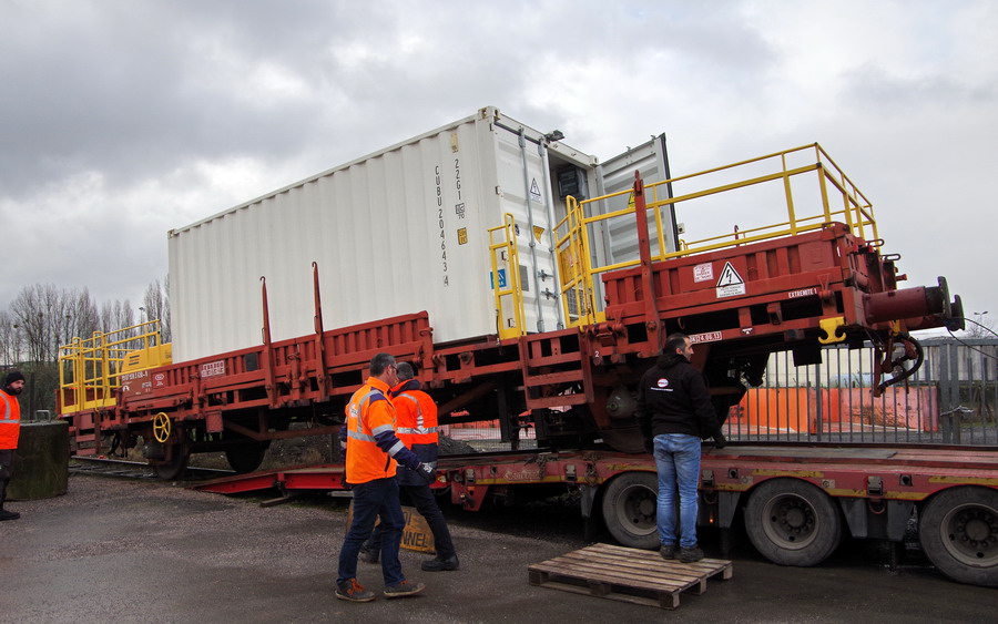 déchargement du wagon en gare d'Origny-Sainte-Benoîte le 09 janvier 2019