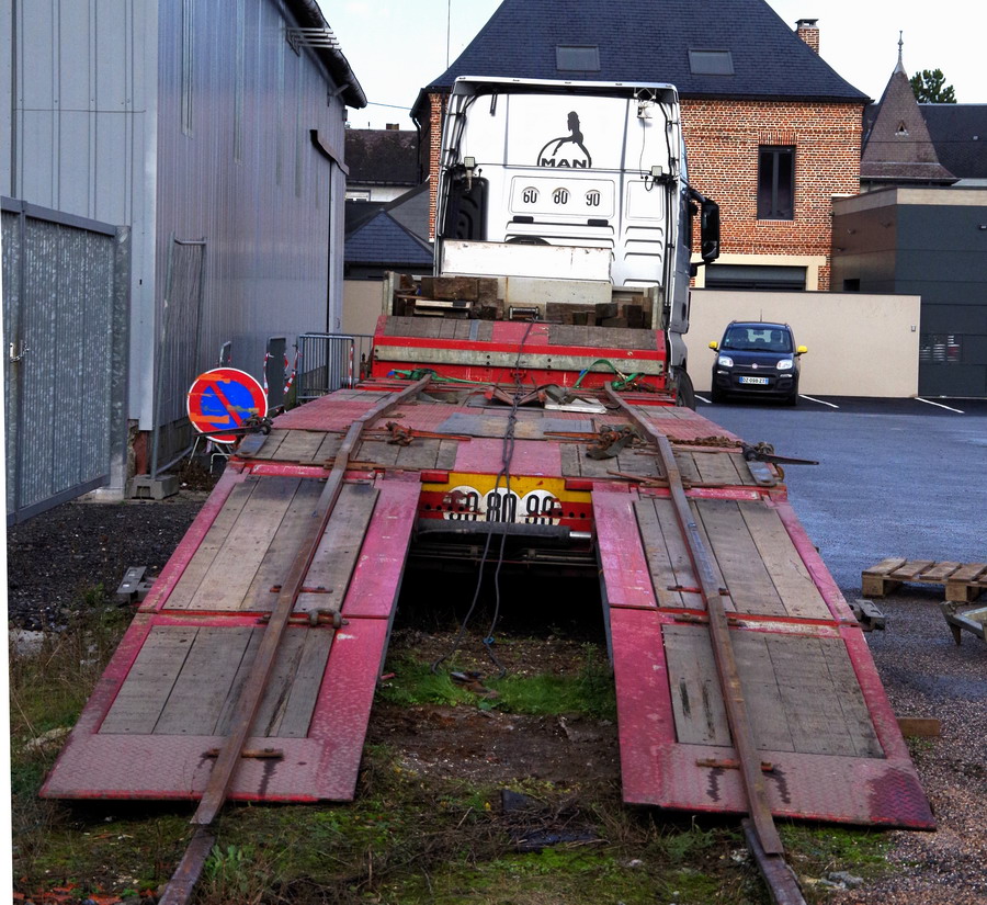 le camion et la remorque spécial transport ferroviaire en gare d'Origny-Sainte-Benoîte le 09 janvier 2019