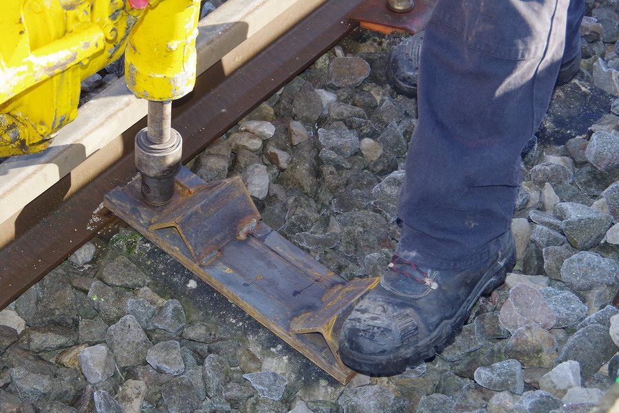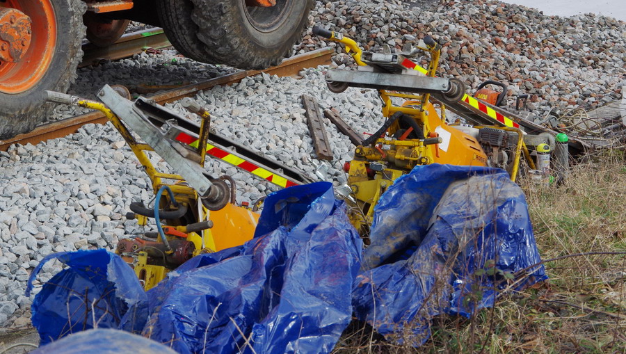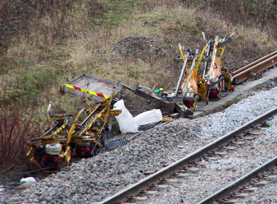 Rouy-le Petit PN n°33 le 12-02-2018 avec Lève-rail hydraulique L2R 522 K Geismar et Frappeur de rail MR 5121 Geismar