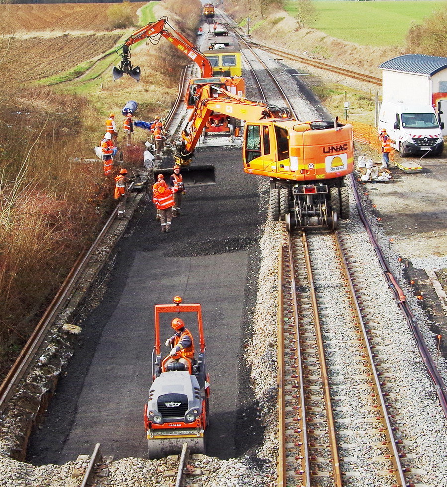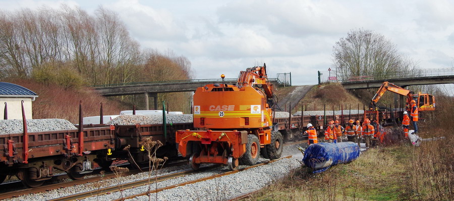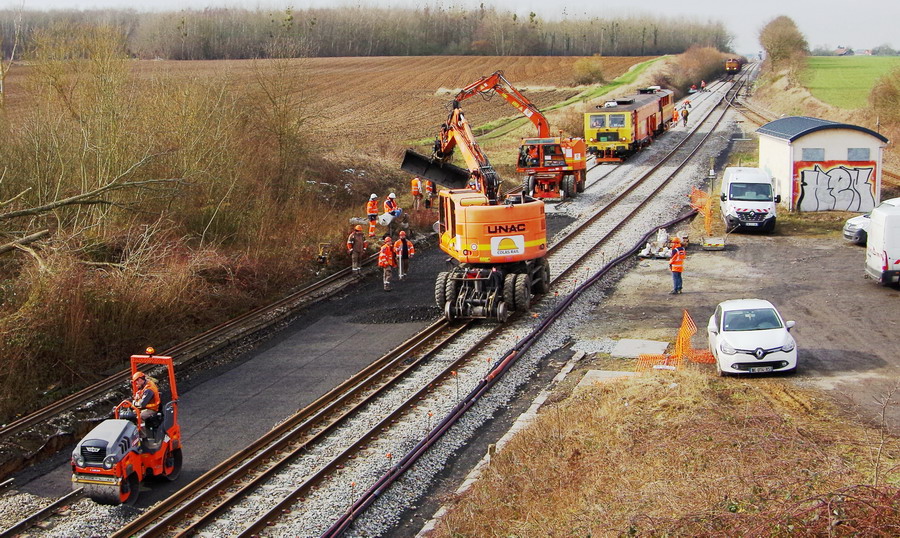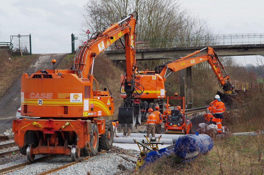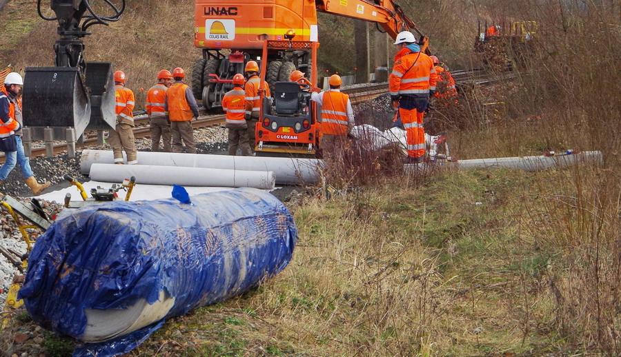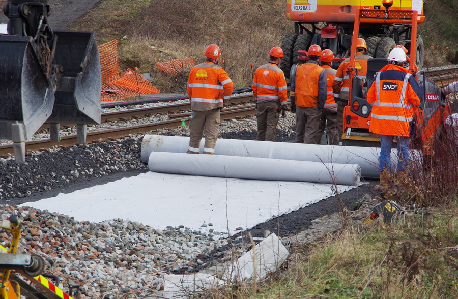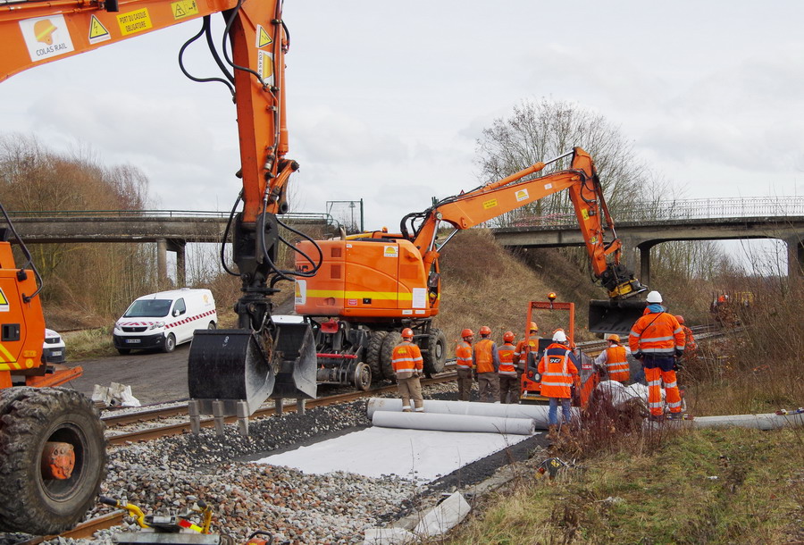 Pour la mise en place d'une sous couche géocomposite drainante par les équipes de Colas Rail, cette partie se terminera normalement vendredi 16 février 2018 après le traitement de la zone boueuse par Colas Rail.