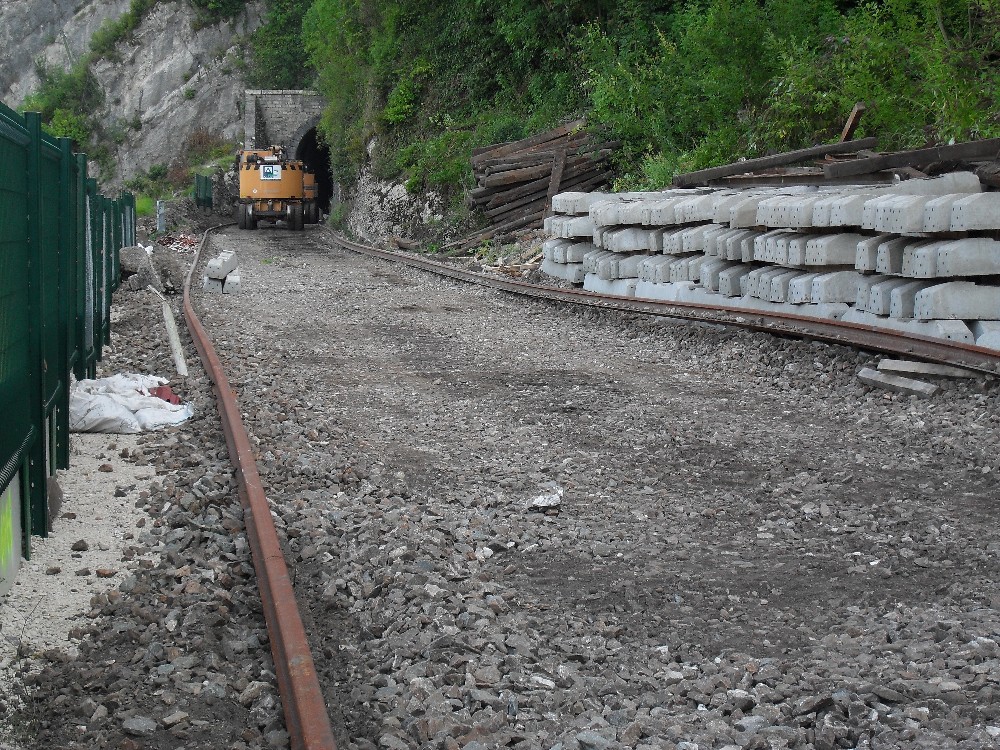 Le chantier est divisé en deux, en bas à gauche de la citadelle, les deux pelles s'activent à mettre les traverses en place, tandis qu'a droite il s'agit de démonter rail est traverses. La partie au centre ne sera traiter que pour le changement de rails, les traverses étant métalliques.