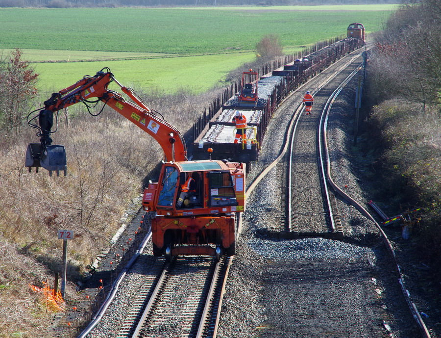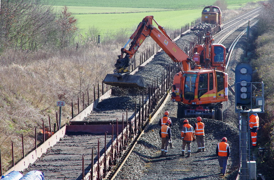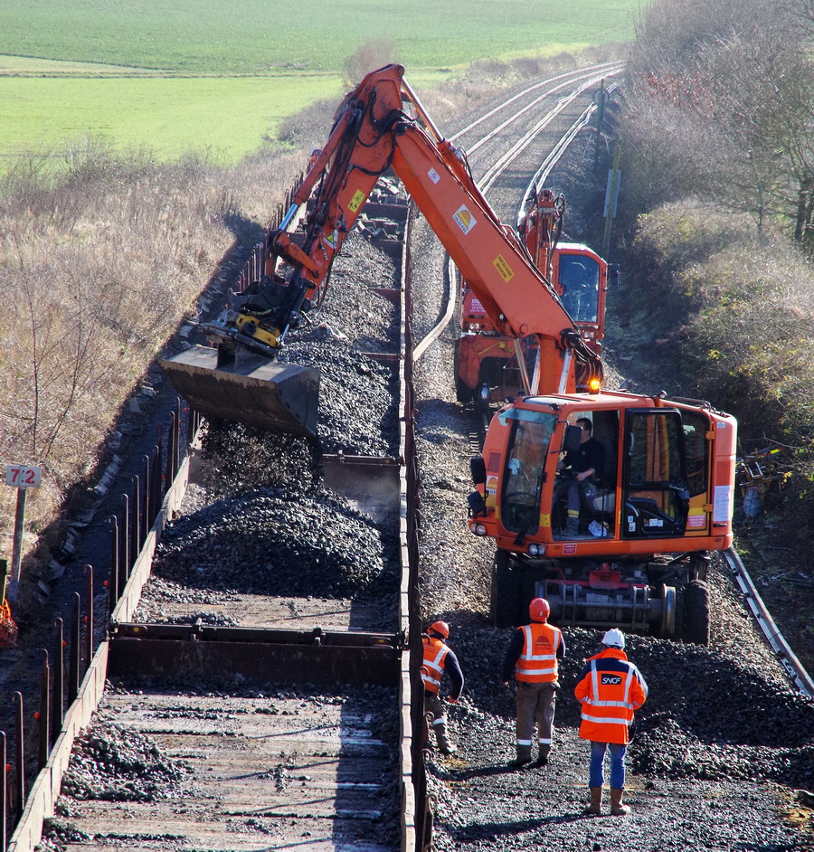l'ensemble des travaux avec les Pelles Rail route UNAC 22 TRR et CASE 788 TRR de Colas Rail à Jussy le 16-02-2018