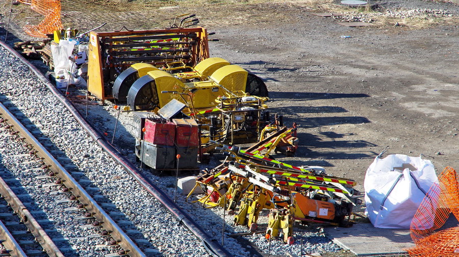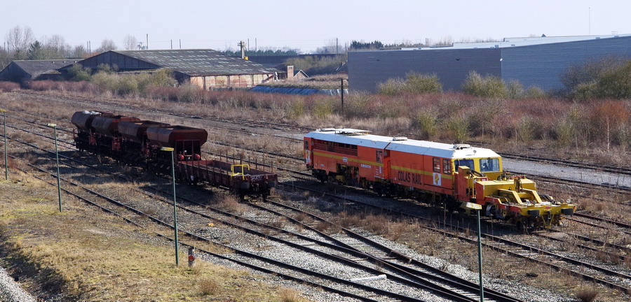 on passe sur la base de travaux Colas Rail de la gare de Chaulnes avec une Bourreuse de ligne