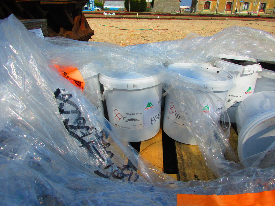seaux de graisse sur la base de travaux de la gare de Reignac-sur-Indre le 28 mars 2019