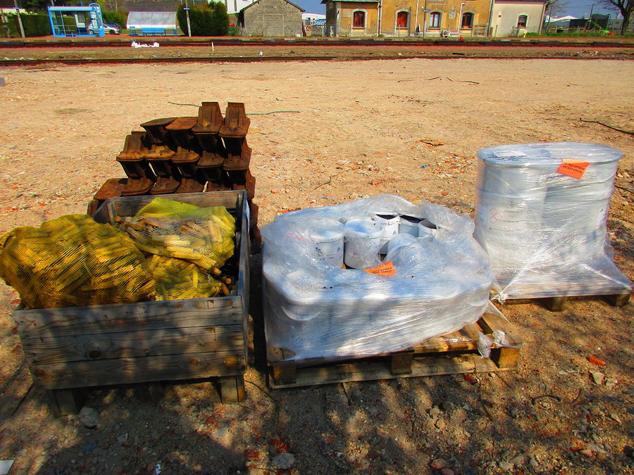 matériel pour la voie et seaux de graisse sur la base de travaux de la gare de Reignac-sur-Indre le 28 mars 2019