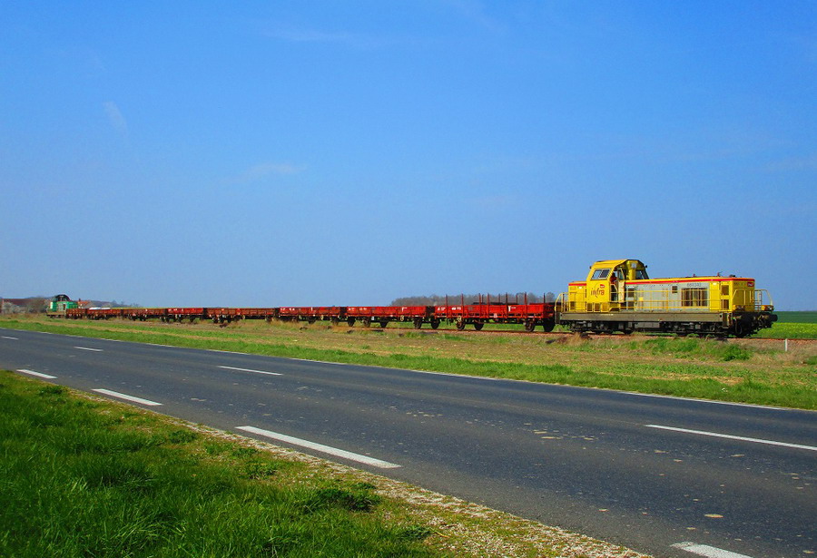 Après avoir déposé les traverses neuves, le train de travaux de Saint Pierre des Corps est en attente au PK 265,700 :