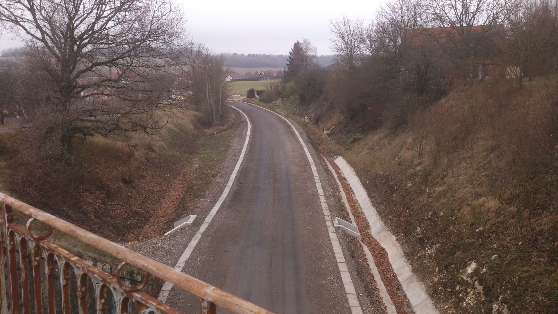 Par contre je me pose une question : dans le projet il est prévu de démolir ce pont pour permettre le passage de la caténaire, mais la glissière de sécurité a été installée jusqu'à ce pont, quasiment jusqu'au tablier, comme si la route allait être conservée... Est-ce qu'un passage plus léger sera réalisé ? (il y a un chemin de randonnée qui passe actuellement par ce pont)
