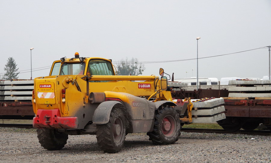 déchargement des traverses béton de la rame par un chariot télescopique LOXAM pour le stock de traverses pour le RVB