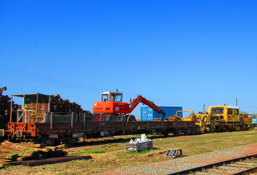 et la pelle Schaeff HML 31 n°032/5992 Infralog Limoges (baptisée "L'Efficiente") équipée d'un grappin à grumes sur un wagon plat à bogies
