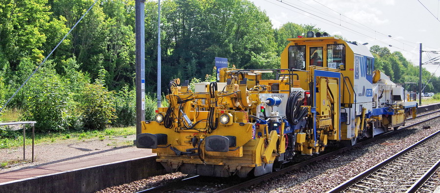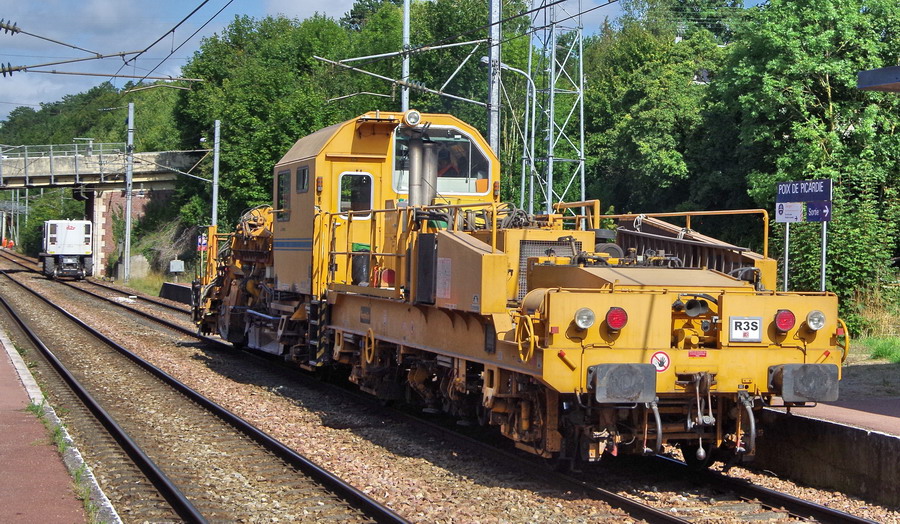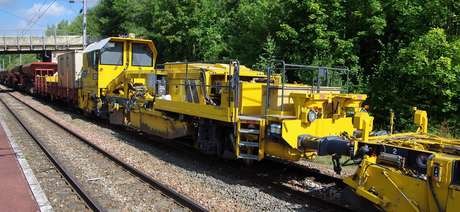 et maintenant sortie des engins de régalage et de bourrage de la base de travaux de la gare de Poix de Picardie pour