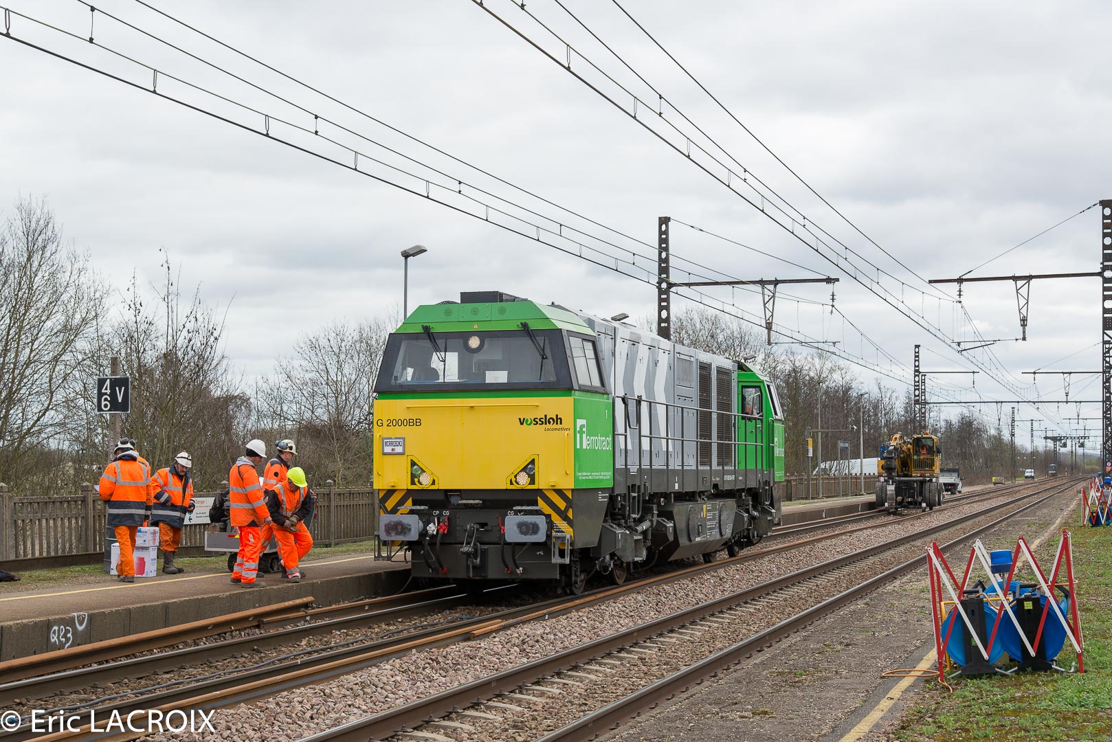 Mise en place des LRS par la G 2000 Ferrotract 92 87 0 002 028-4 F-FRT à Villeneuve la Guyard le 20 mars 2017.