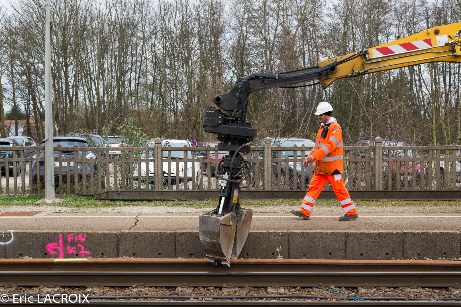 Mise en place des LRS par la pelle rail route Vaiacar V704FR - 2011V7026 - ESAF à Villeneuve la Guyard le 20 mars 2017.