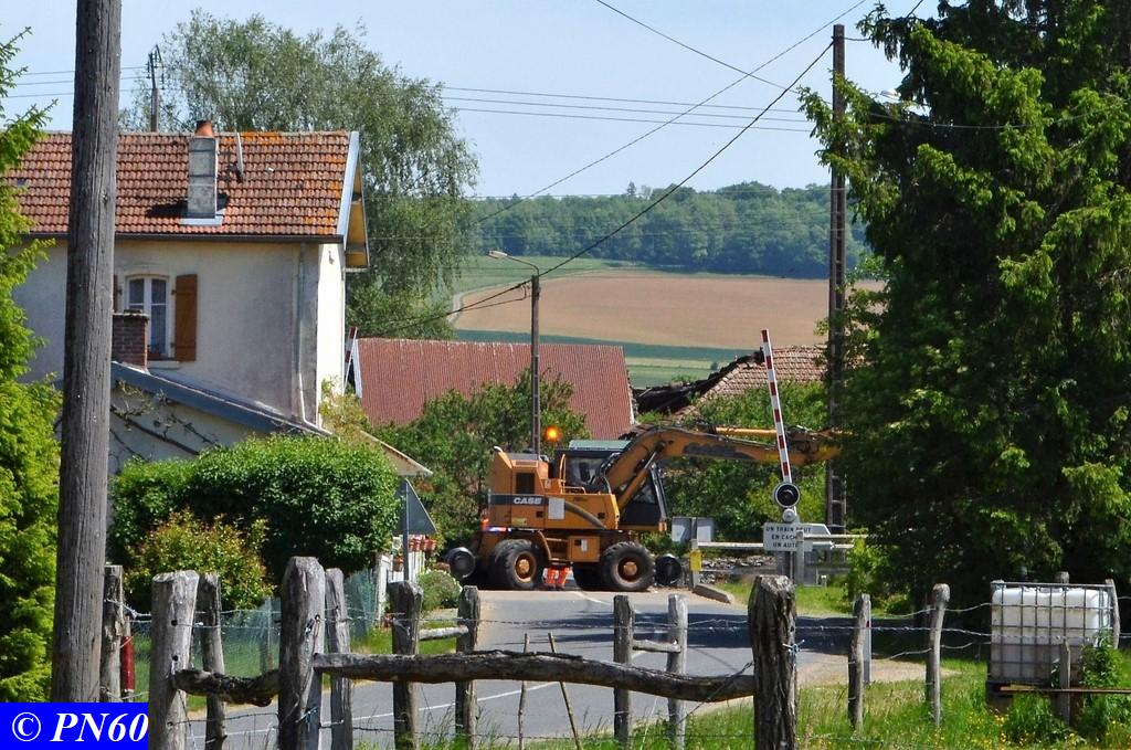 Le 26 mai 2017, une pelleteuse rail-route CASE se prépare à entrer en action au niveau du PN60 à Brainville sur Meuse.