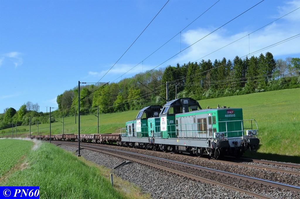 un UM de BB 69000 (69505 & 69488) tracte un court train de wagons plats en direction de Chalindrey.