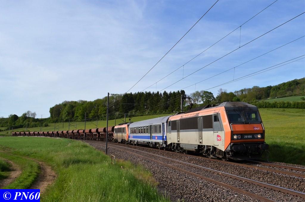 Le 17 mai 2017, 2 BB 26000 (26186 & 26209) encadrent une voiture de contrôle et mesure de la voie en direction de Chalindrey.