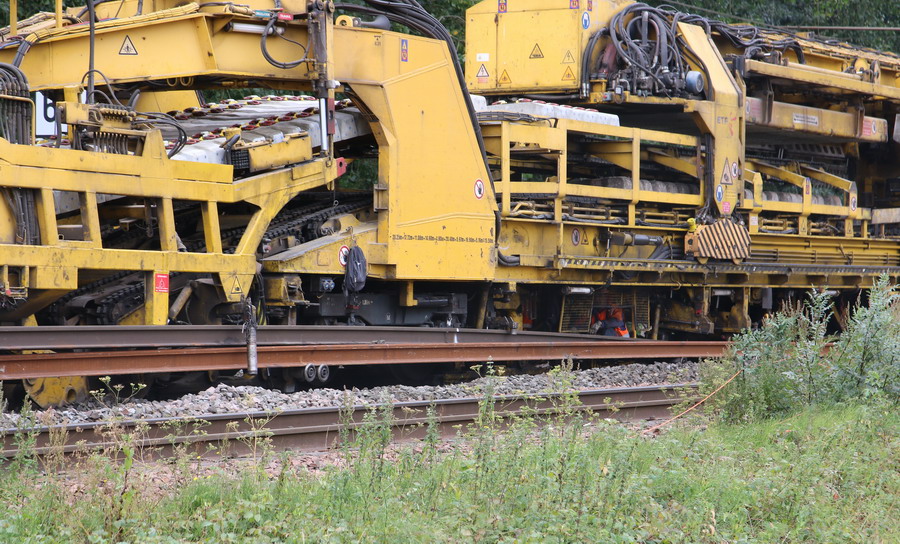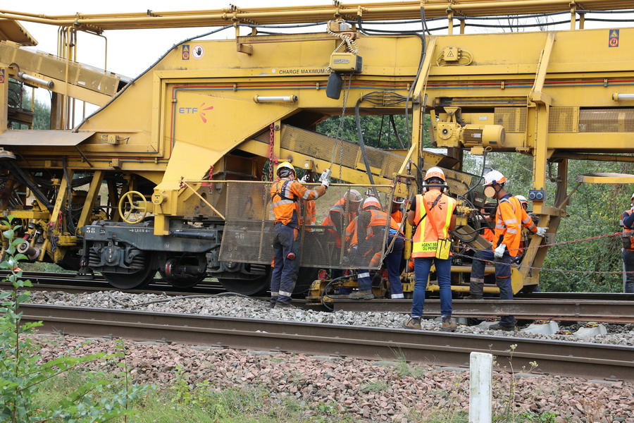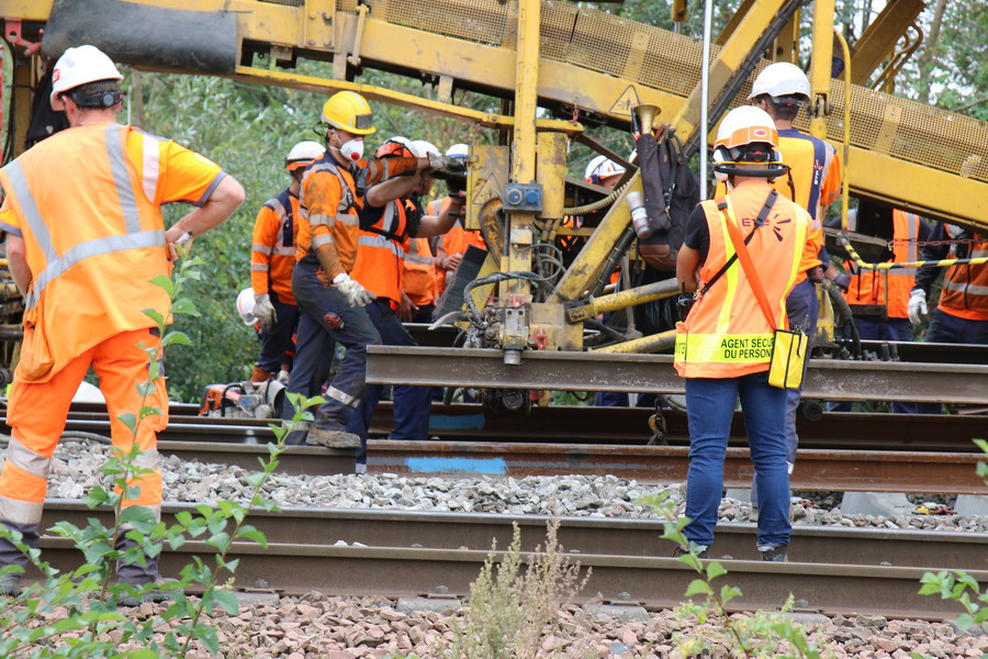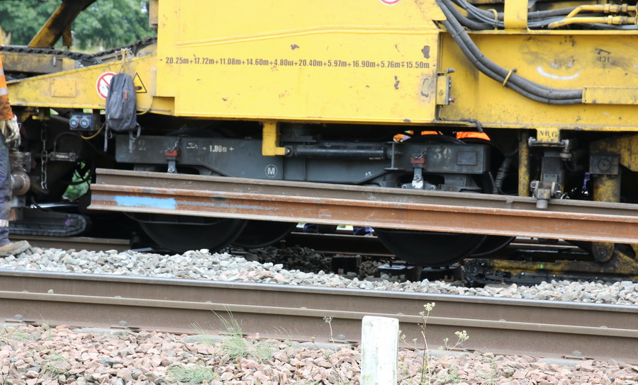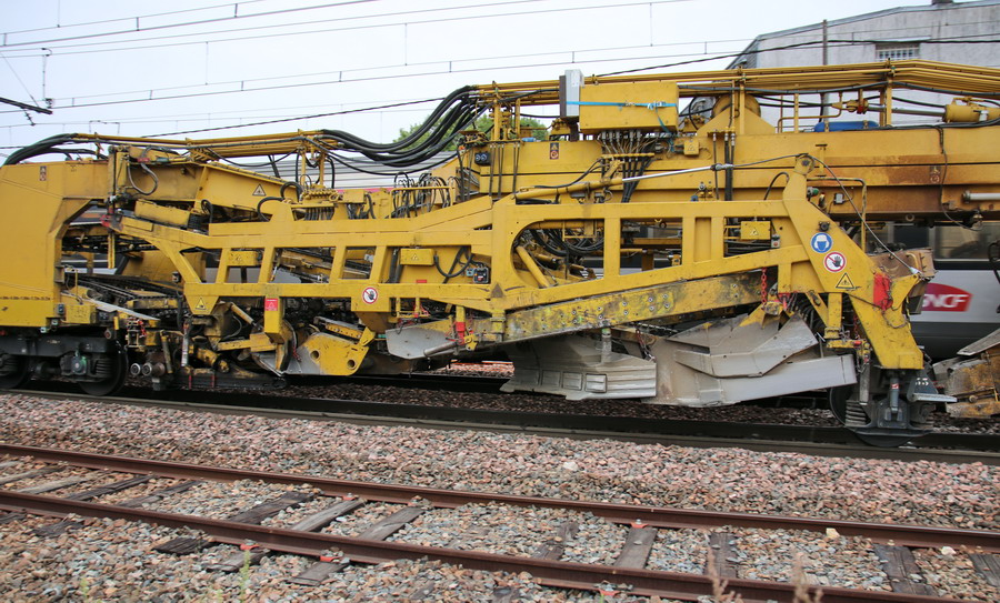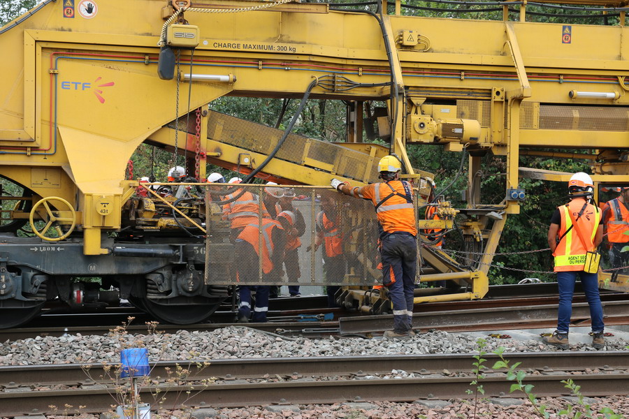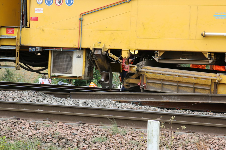 . wagon 5 WF - force avec poutre : évacuation du ballast, enlèvement des anciens rails et pose de nouveaux longs rails soudés