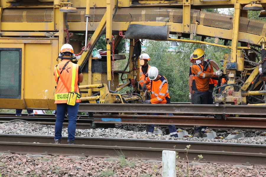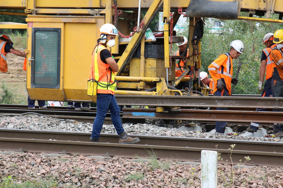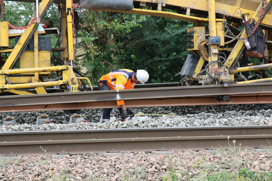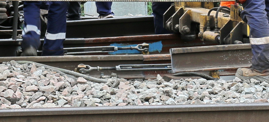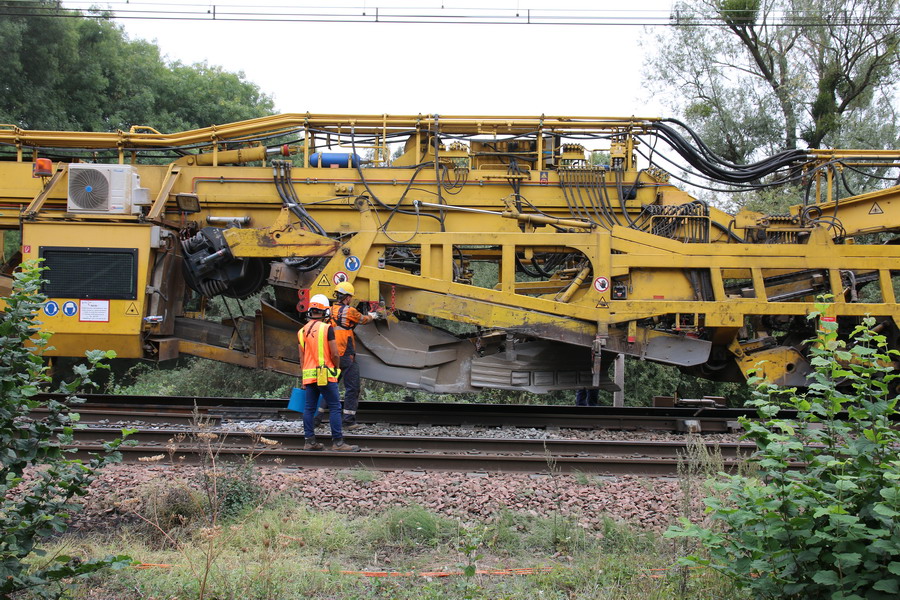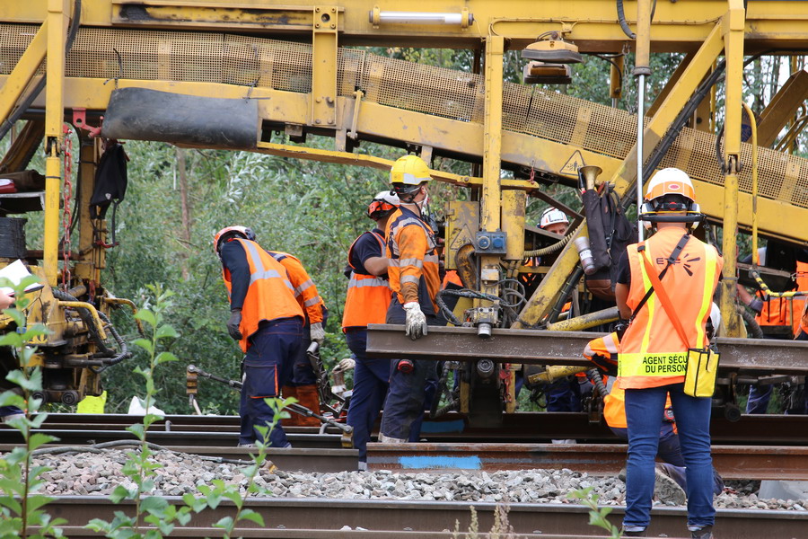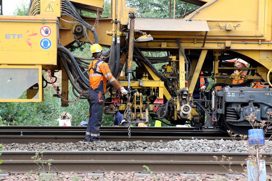 . wagon 5 WF - force avec poutre : évacuation du ballast, enlèvement des anciens rails et pose de nouveaux longs rails soudés