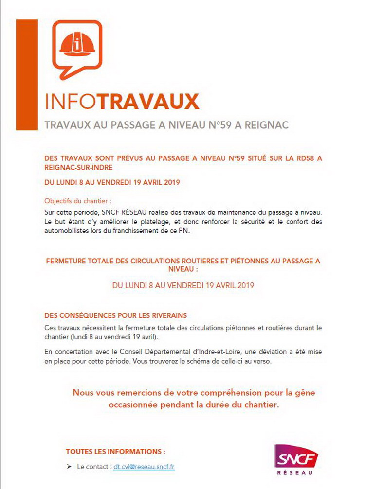 Voici une information pour les travaux sur le PN N°59 à Reignac-sur-Indre