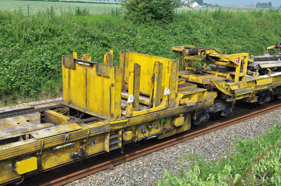 Train de pose P95 ETF 99 87 9 311 503-6 - ETF - "Addax avec le wagon 3 WTP - de transfert et pivotement des palettes de traverses conditionnées PK 20 à Marcelcave le 04-06-2018