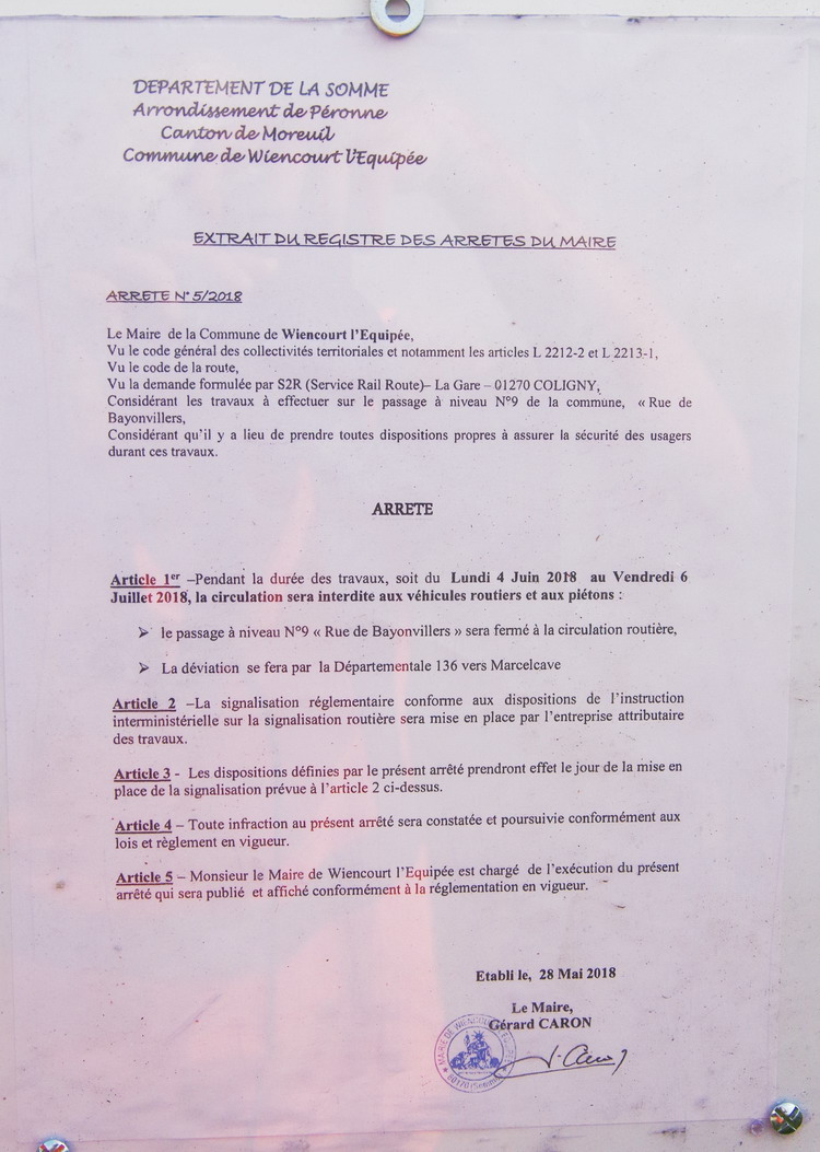 et maintenant au niveau du PN n°9 de Wiencourt-l'Equipée (80) rue de Bayonvillers pour la fermeture du PN entre le lundi 05 juin et le