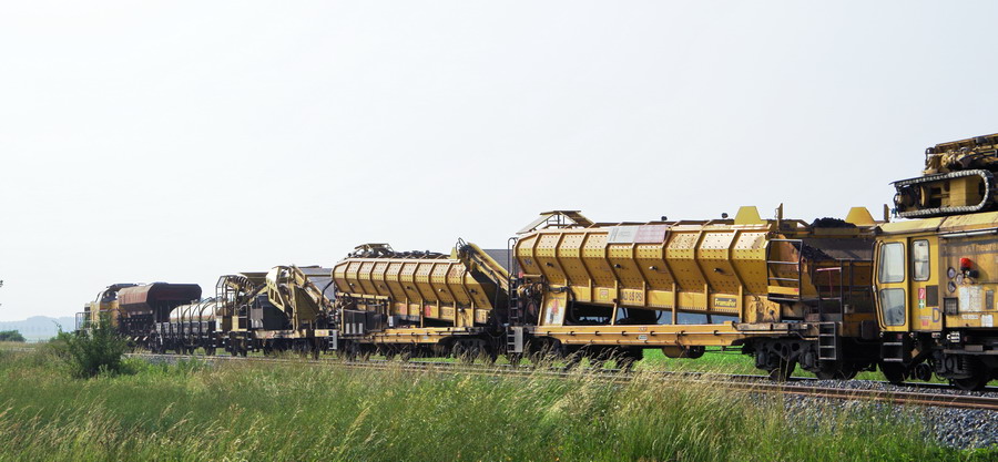 . wagon 5 WF - force avec poutre : évacuation du ballast, enlèvement des anciens rails et pose de nouveaux longs rails soudés