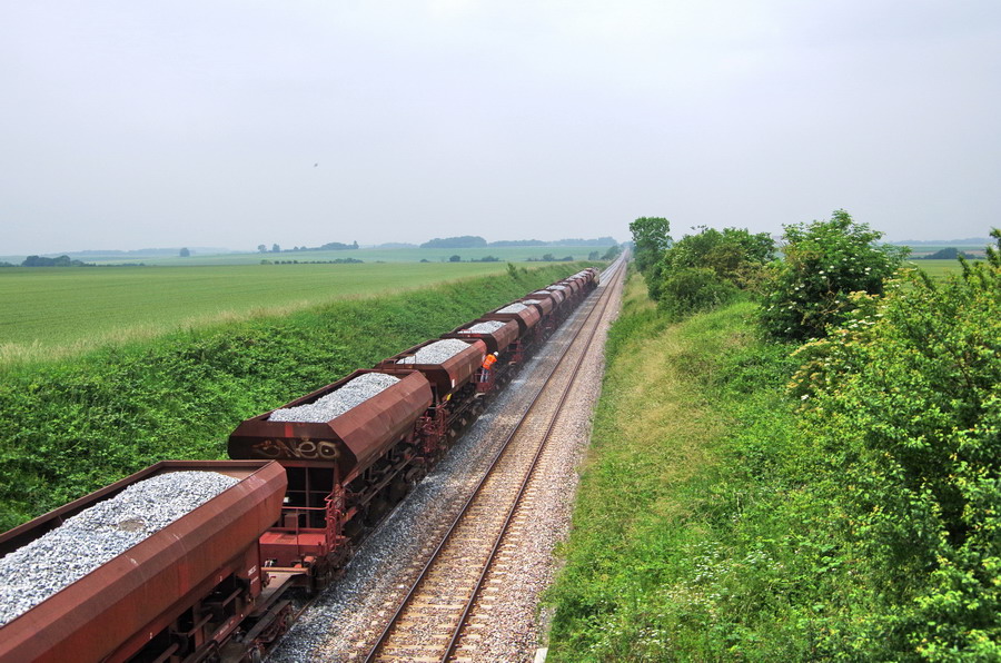 la rame avec la BB 75037 Akiem + wagon plat S39 + 23 Trémies D12 + E4029 ETF à Harbonnières (80)