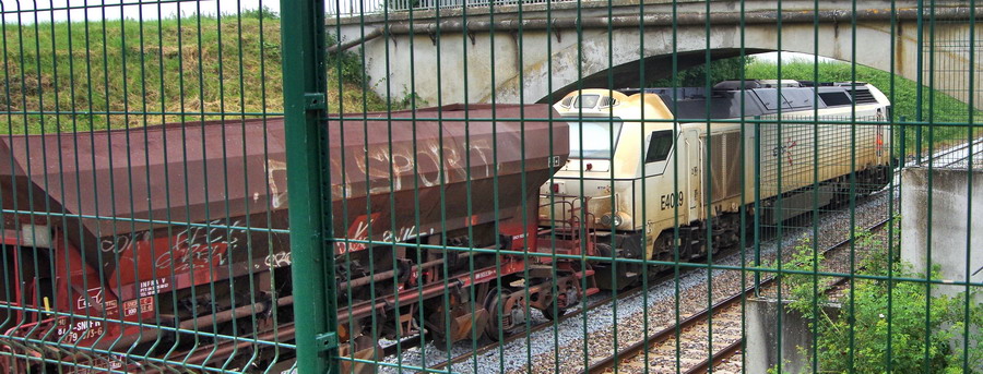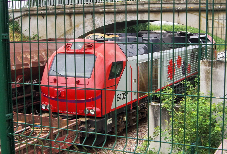 la rame avec la E 4027 VFLI au niveau du pont rue Jacques Deflandre