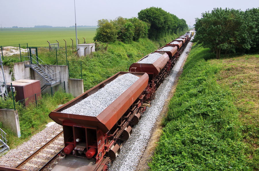 la rame avec la BB 75037 Akiem + wagon plat S39 + 23 Trémies D12 + E4029 ETF au niveau du pont rue Jacques Deflandre