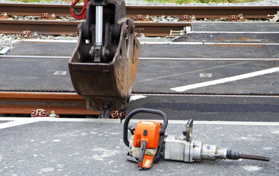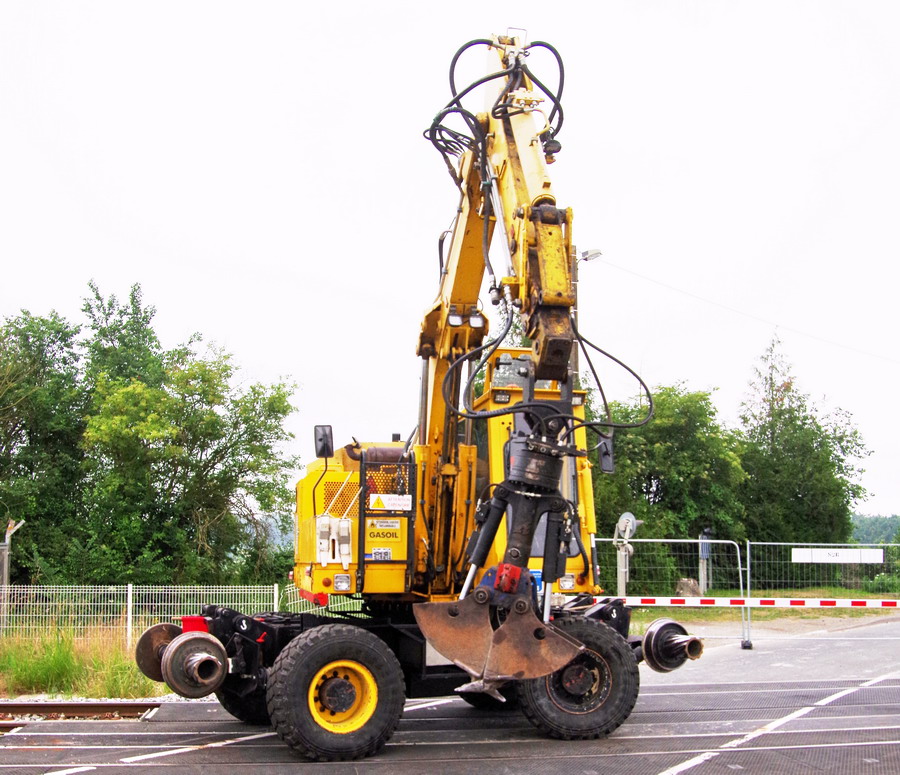 la Geismar KGT-V n°4781 de Meccoli E pour la remise en place des plaques STRAIL avec un godet munis de trois crochets