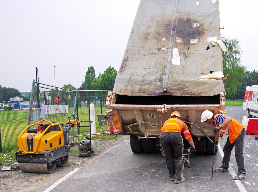 fin de goudronnage et petit rouleau compresseur pour la finition au PN n°36 d'Eppeville le 11-06-2018