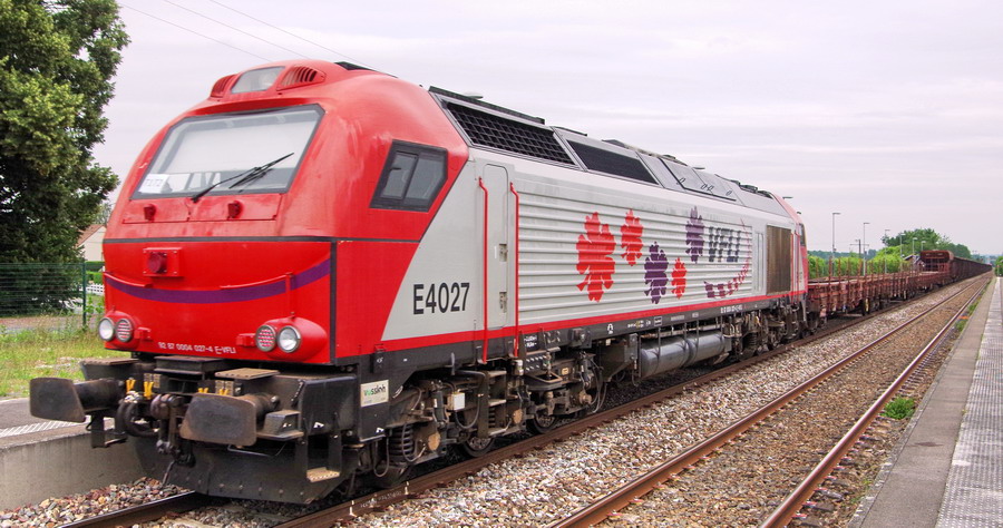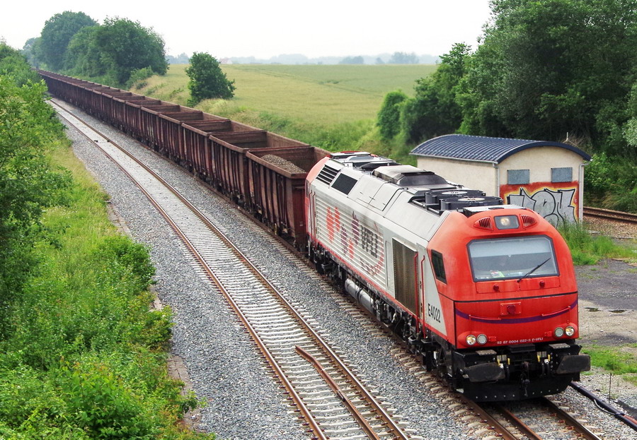 retour du train n°T1T2 rame de tombereaux avec la Euro 4022 de VFLI gare de Mennessis le 14-06-2018
